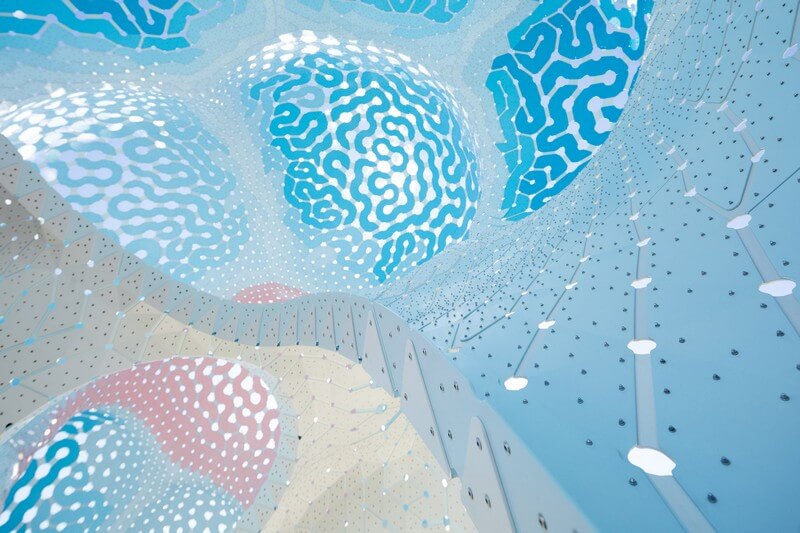 The orbs appear to be “filled with air,” but instead are created with a continuous structural skin of three-millimetre aluminium that is 36,089 feet (11,000 meters) long. Visitors can access the structure from sidewalks that cut across the property and pass through the design, allowing people to walk up underneath the pale shell.