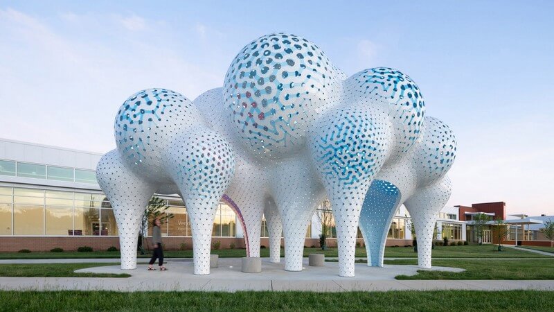 New York design studio The Very Many has built a white orbed pavilion in Charlotte, North Carolina with bulbs shaded soft blue and pink inside. Pillar of Dreams is a 26-foot-high (eight-metre) structure made from two layers of thin aluminium, perforated and layered on top of each other to create a single bulbous form. Pillar of Dreams is made from nine hollow legs that support a mass of differently sized globes that merge together.