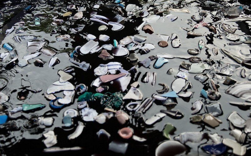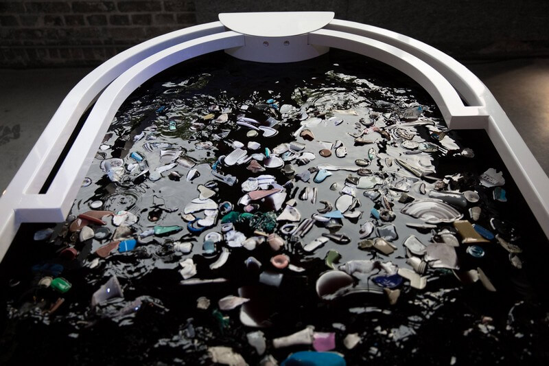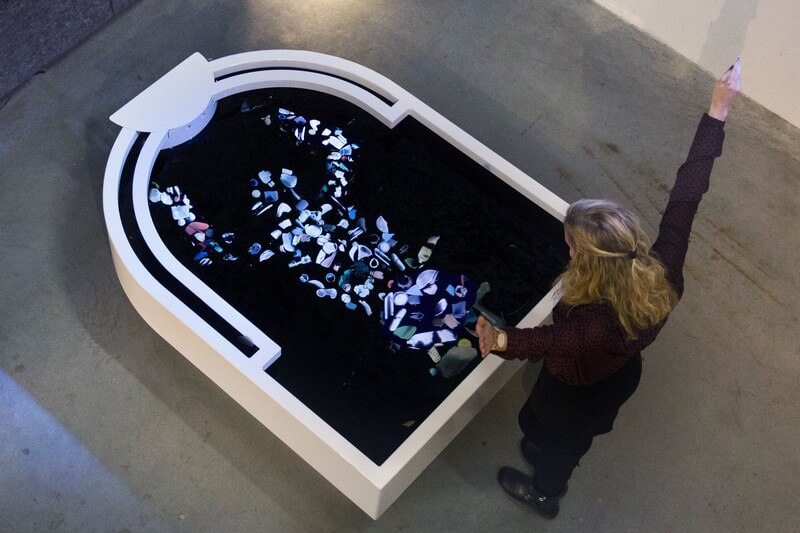 The installation consists of what appears to be a large empty white pool filled with black water. When you step in front of it, hundreds of pieces of actual ocean plastic come floating to the surface, forming your silhouette.
