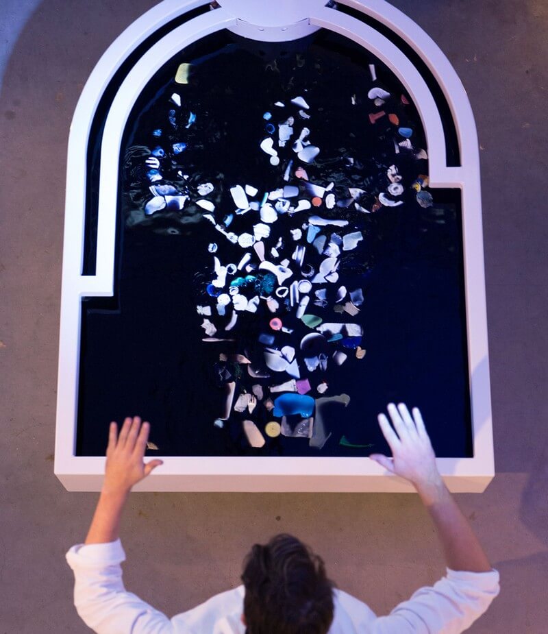 As you move your body or wave your arms, pieces of plastic submerge again while others float to the surface showing your own real-time reflection moving along with you, made of plastic waste fished from the oceans. Plastic Reflectic warns us by showing us our own bodies made out of plastic ocean trash, but also shows that everyone has a personal influence on this growing problem.