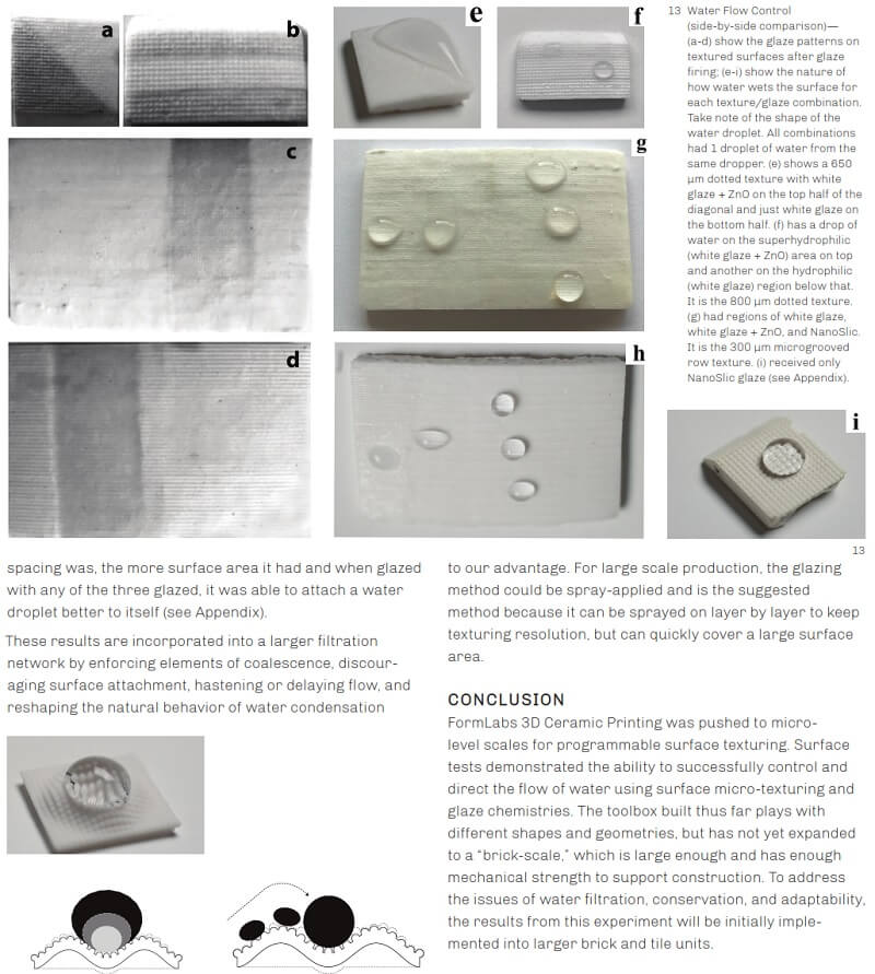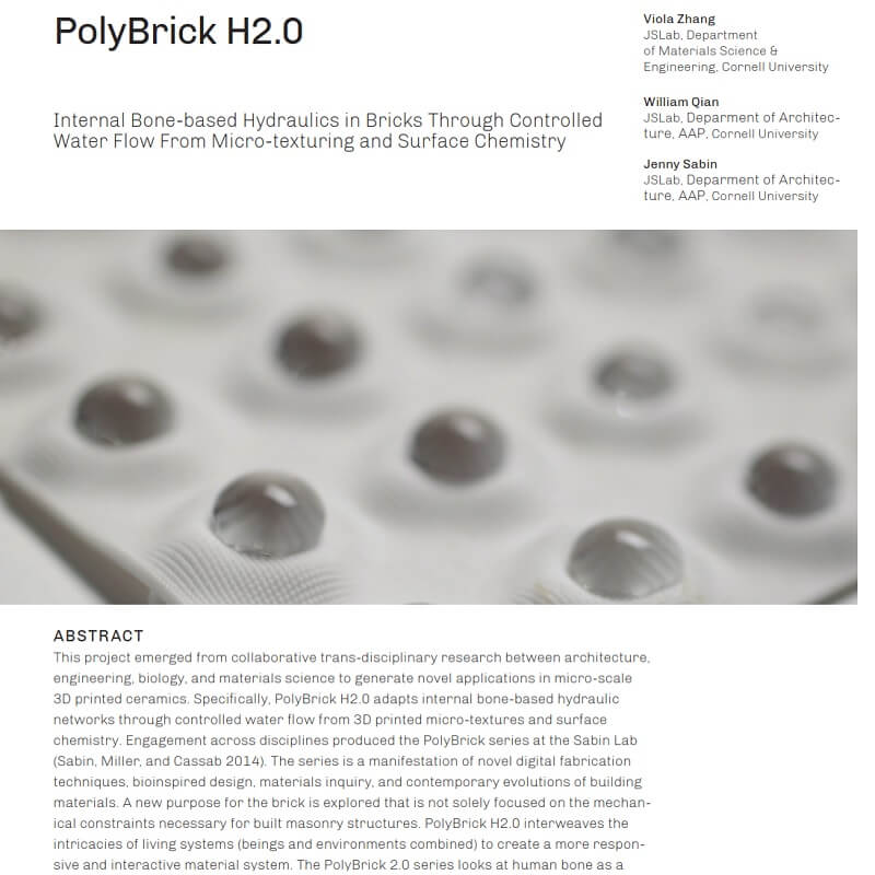 This project by Viola Zhang, William Qian and Jenny Sabin emerged from collaborative trans-disciplinary research between architecture, engineering, biology, and materials science to generate novel applications in micro-scale 3D printed ceramics. Specifically, PolyBrick H2.0 adapts internal bone-based hydraulic networks through controlled water flow from 3D printed micro-textures and surface chemistry.