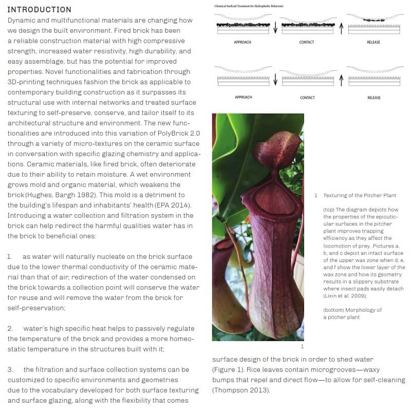 Engagement across disciplines produced the PolyBrick series at the Sabin Lab (Sabin, Miller, and Cassab 2014) . The series is a manifestation of novel digital fabrication techniques, bioinspired design, materials inquiry, and contemporary evolutions of building materials. A new purpose for the brick is explored that is not solely focused on the mechanical constraints necessary for built masonry structures.