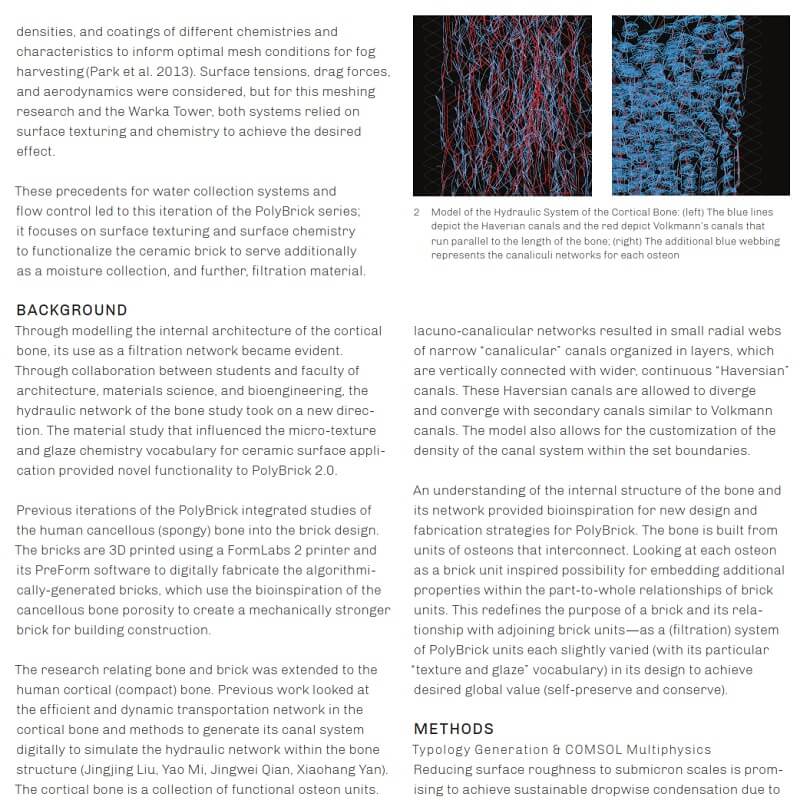 PolyBrick H2.0 merges the cortical bone hydraulic network with new functionalities as a water filtration and collection system for self-preservation and conservation as well as passive cooling solutions. It also pushes the ability of 3D printing techniques to the microscale. These functionalities are investigated under context for a better construction material, but its use may extend further.