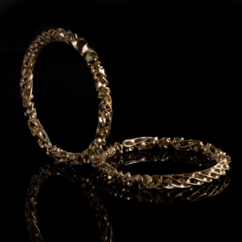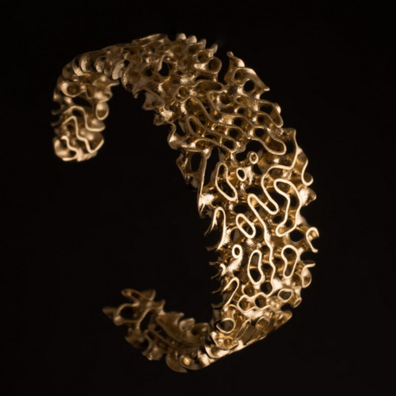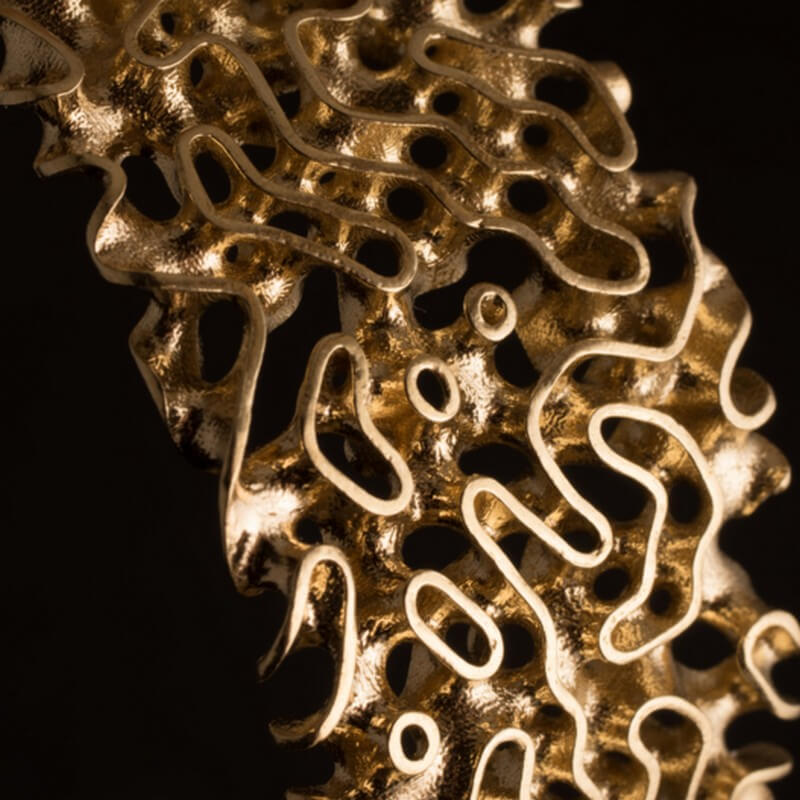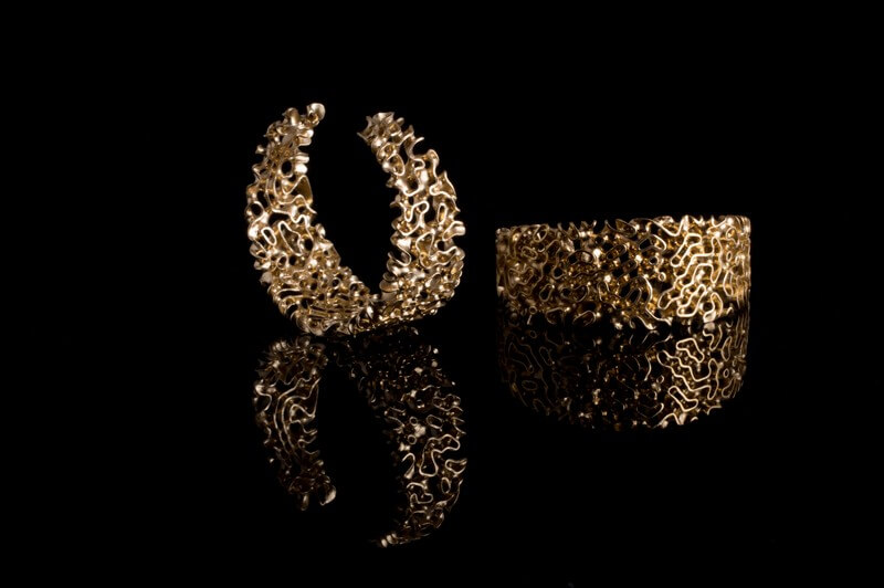 Porifera is a 3D-printed brass jewelry collection inspired by the forms of deep-sea dwelling glass sponges. These ancient sponges form reefs of glass with complex, porous architectures that are home to many species. The jewelry designs are computationally generated by creating minimal surface networks along cellular scaffolds that adapt to different volumes and densities.