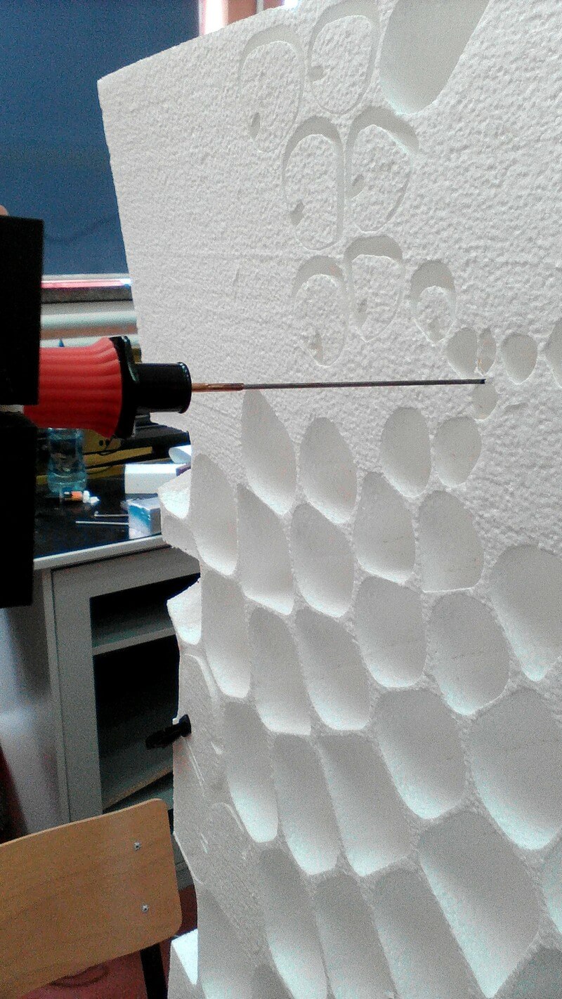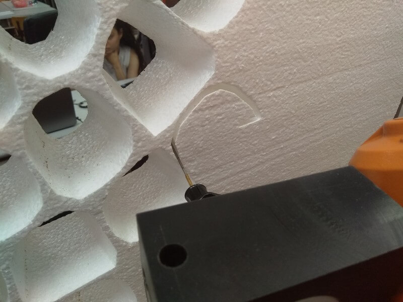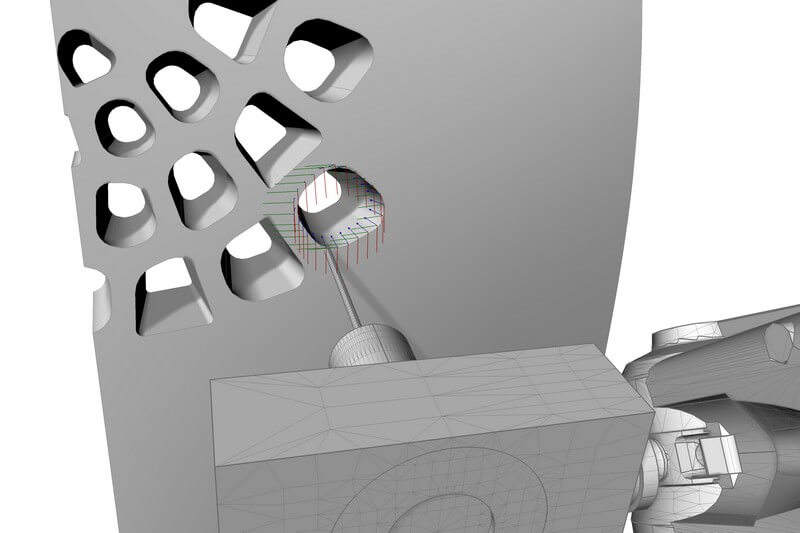 The process considers the utilization of a hot knife tool mounted as an end effector for an industrial robot, which vaporizes the sides of the cells, thus detaching it from the initial block. Such porous surface designs can be applied in response to building’s performances such as ventilation, insulation and air quality.