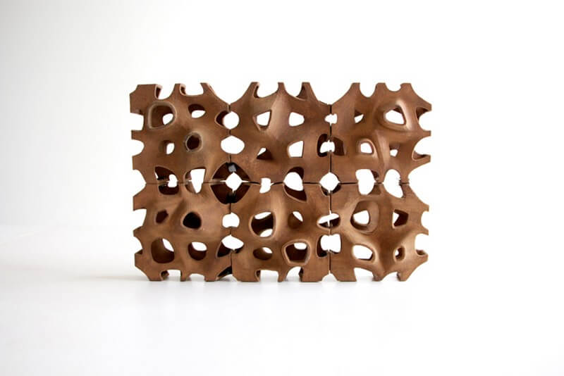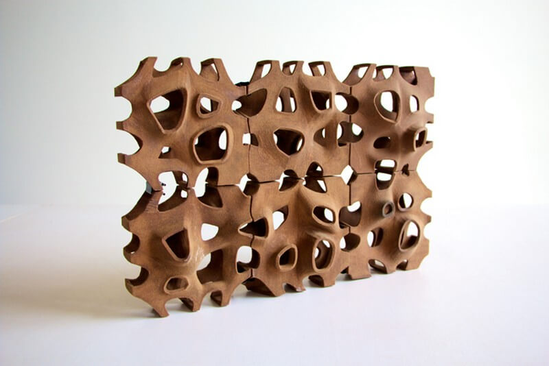 Poroso by Emerging Objects is an experiment in block aggregation using a specially formulated wood material. The wood has a higher accuracy and finer finish. It is also stronger and more easily able to be excavated from the print bed.