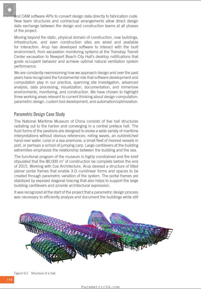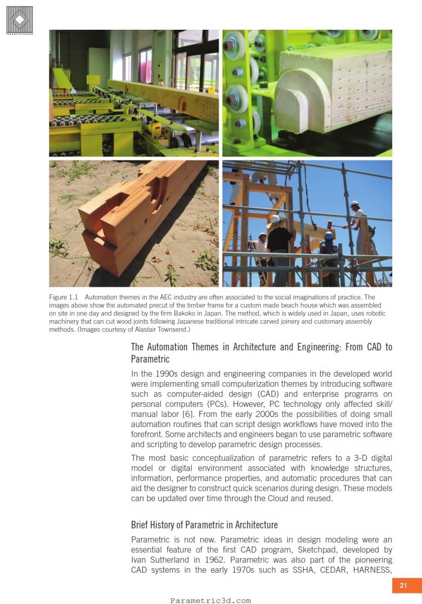 Parametrichouse: A mixture of algorithms, robots, software, and avatars, is transforming all types of jobs and industries. This book responds to one critical question for the design and construction industry: “how are architects, engineers, and contractors using information technology to further automate their practices?” Addressing the use of new digital technologies, particularly parametric automation for design and construction in the building industry, this book looks at how technologically advanced architectural and engineering practices are semi-automating their design processes by using sophisticated algorithms to transform their workflows. The book also documents a set of firms that are further advancing automation by using pre-fabrication, modularization, and custom designs via robotics.