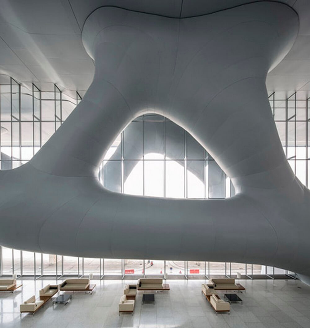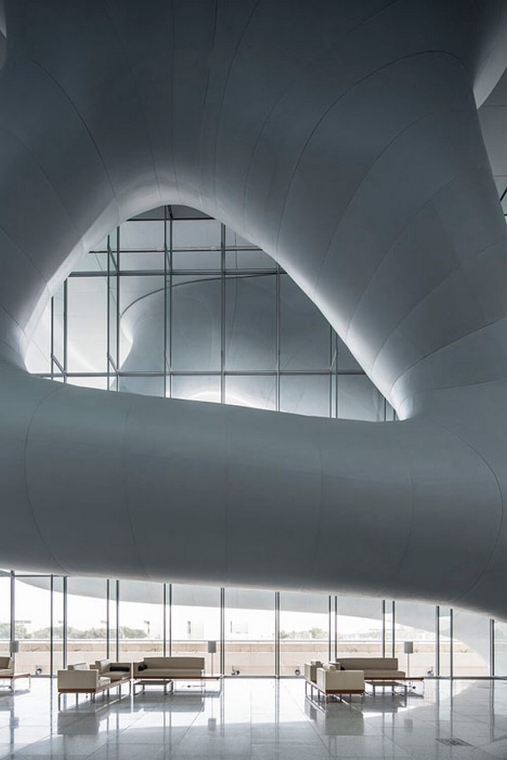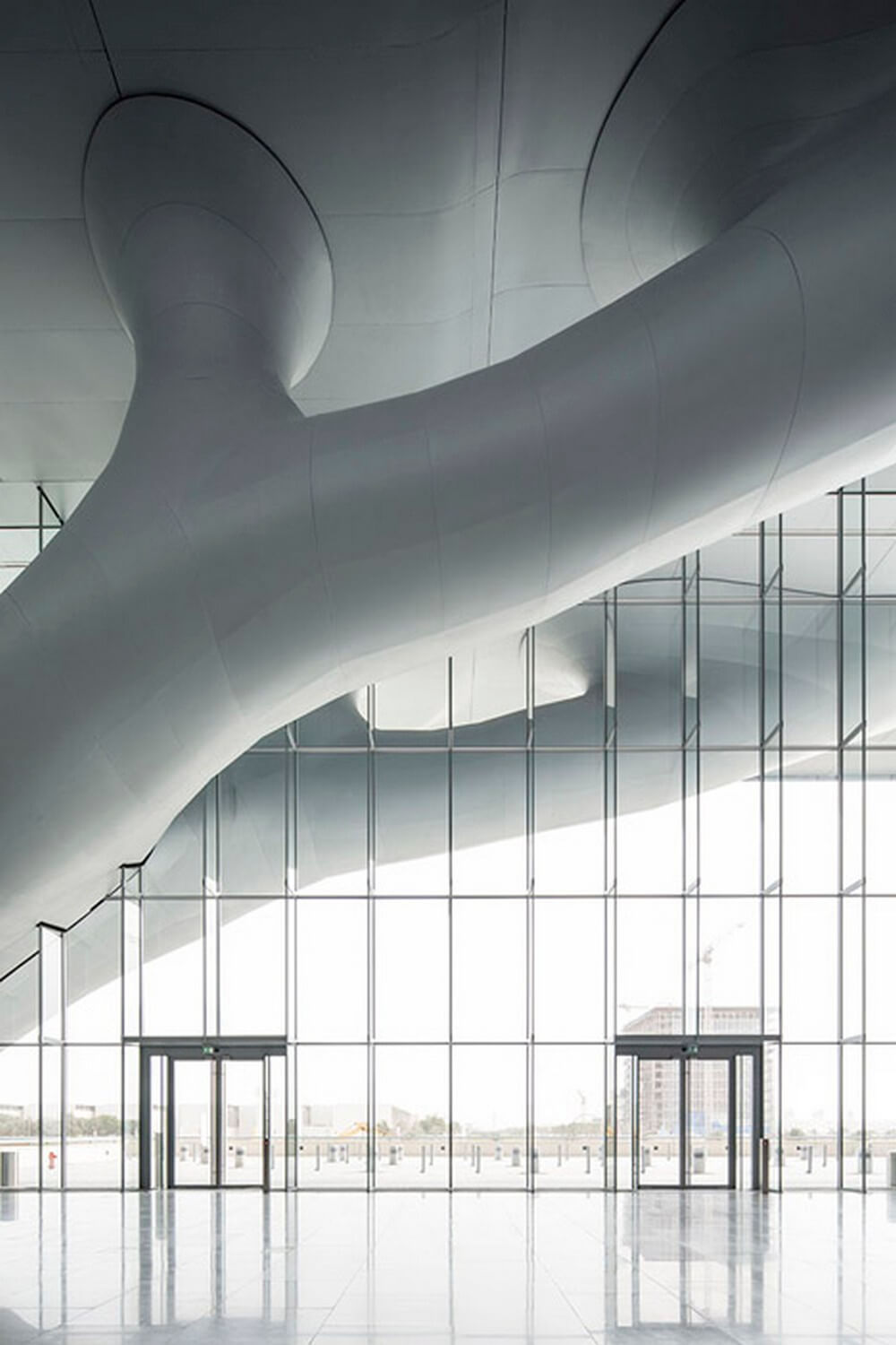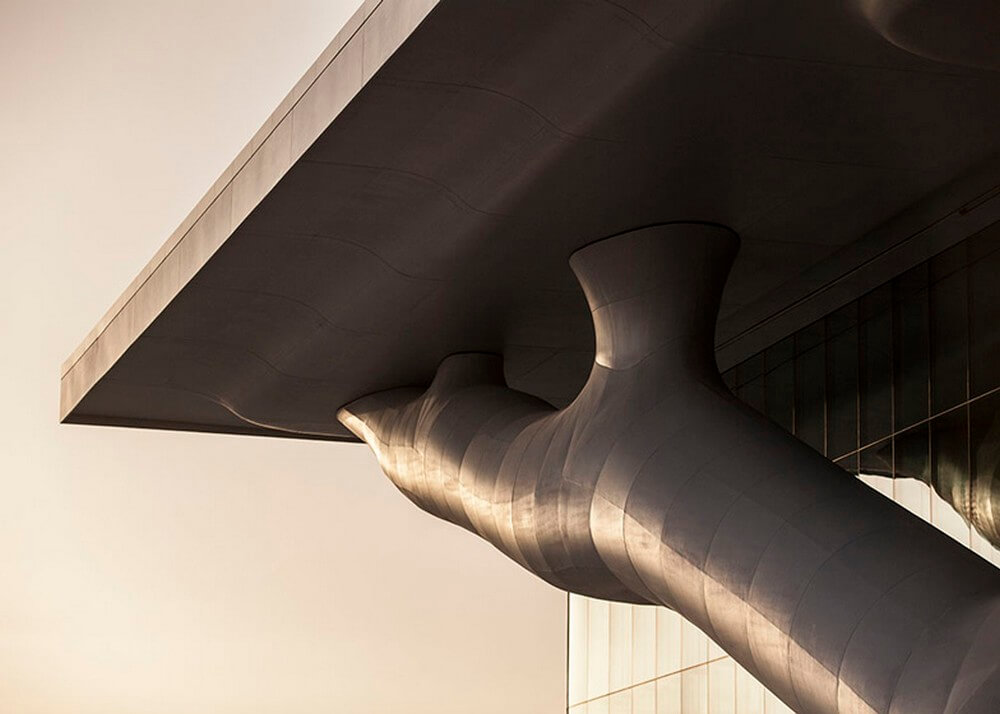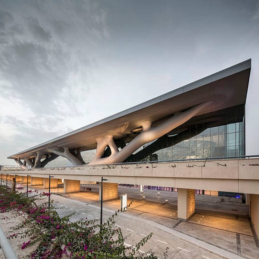 Gigantic tree-like columns support the overhanging roof of the Qatar National Convention Centre by Japanese architect Arata Isozaki. The building was designed by Arata Isozaki to reference the Sidrat al-Muntaha, a holy Islamic tree that is believed to symbolise the end of the seventh heaven.
