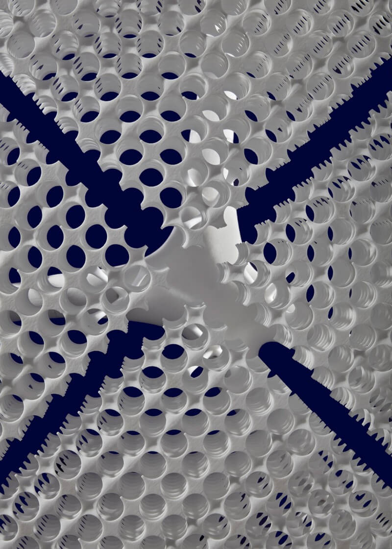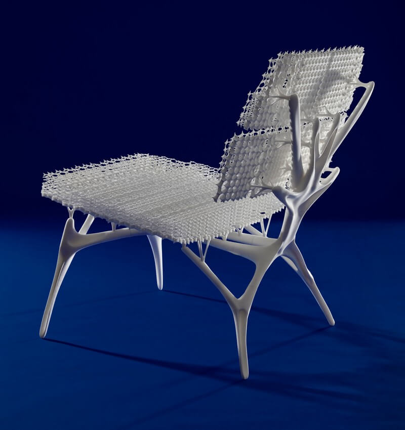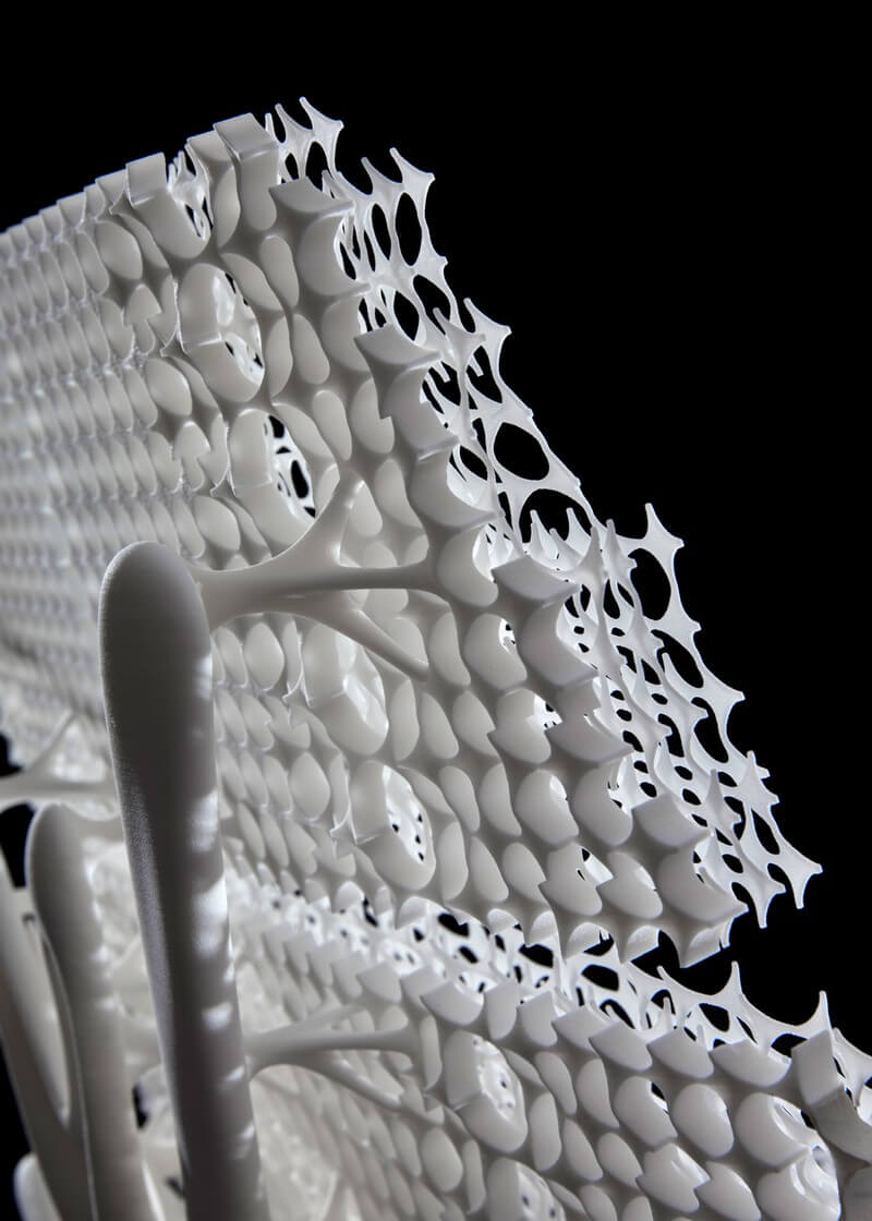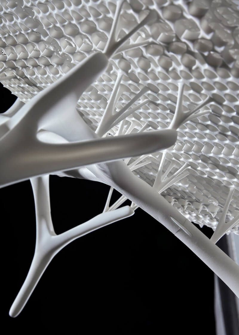 Designer van Daal’s careful observation of the intricacies of flowers and the mycelium networks of fungi, alongside the symmetrical of skeletal structures of Radiolaria and Bryozoa zooplankton all provided inspiration for a 3D printed seating solution assembled into a lattice – sans any requirement of glue.