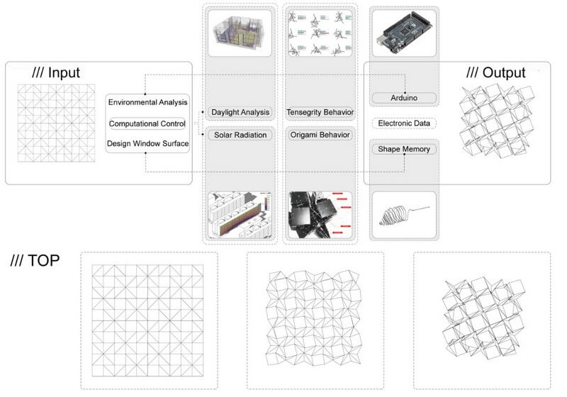 Based on the data from the radiation sensors, the lengths of the shape memory alloys are altered using electric wires and are parametrically linked to the input data. The transformation in the resulting overall surface is directly linked to the desired levels of daylighting and solar exposure. Authors conclude with directions for future research, including full scale testing, advanced simulation, and multi-objective optimization.