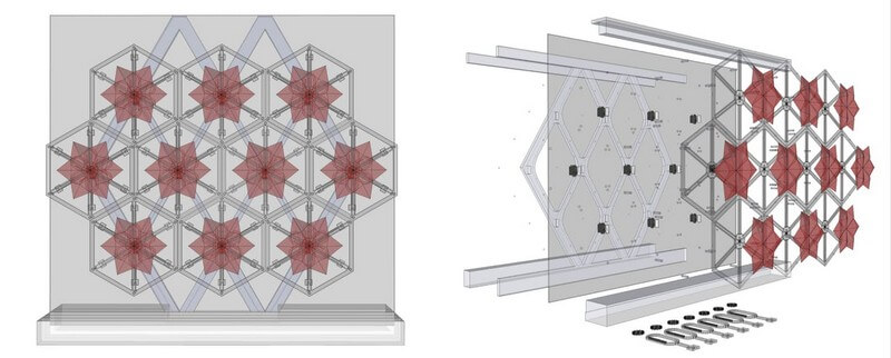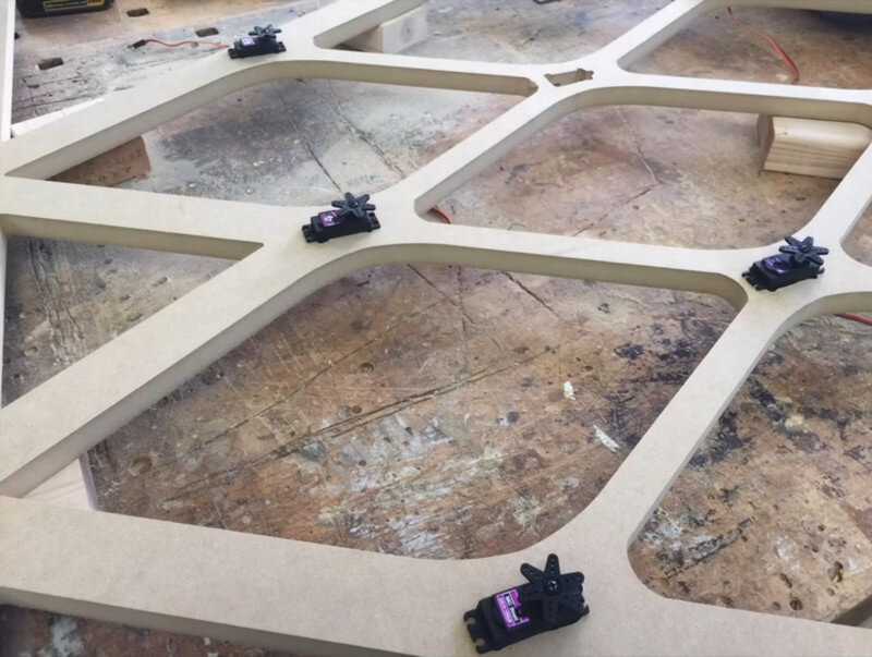 Each tile is connected to a servomotor that receives input from a photoresistor sensor. The sensor provides information about the surrounding environment allowing each tile to alter its shape accordingly.
