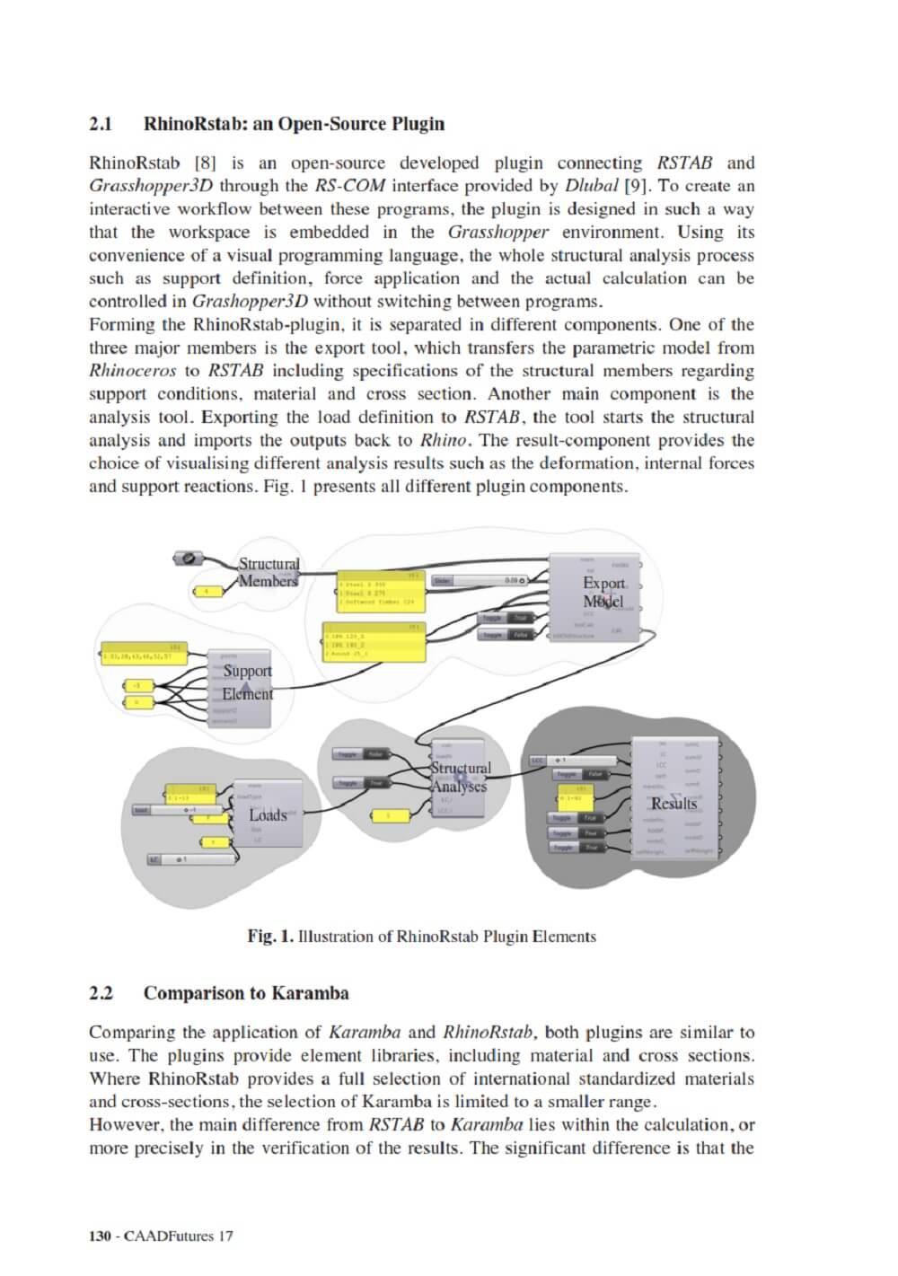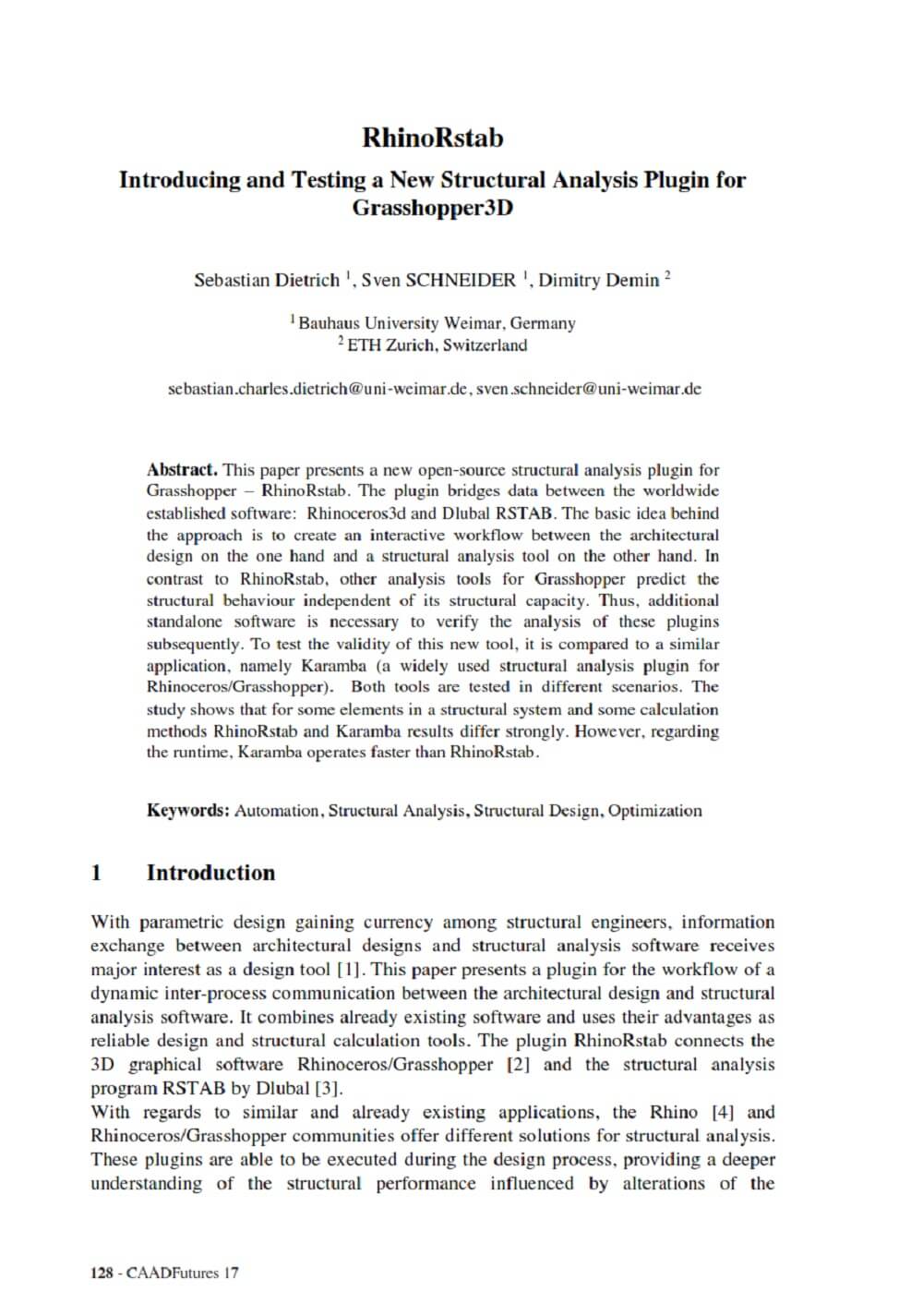 This paper by Sebastian Dietrich, Sven Schneider and Dimitry Demin presents a new open-source structural analysis plugin for Grasshopper – RhinoRstab. The plugin bridges data between the worldwide established software: Rhinoceros3d and Dlubal RSTAB. The basic idea behind the approach is to create an interactive workflow between the architectural design on the one hand and a structural analysis tool on the other hand. In contrast to RhinoRstab, other analysis tools for Grasshopper predict the structural behaviour independent of its structural capacity. Thus, additional standalone software is necessary to verify the analysis of these plugins subsequently.