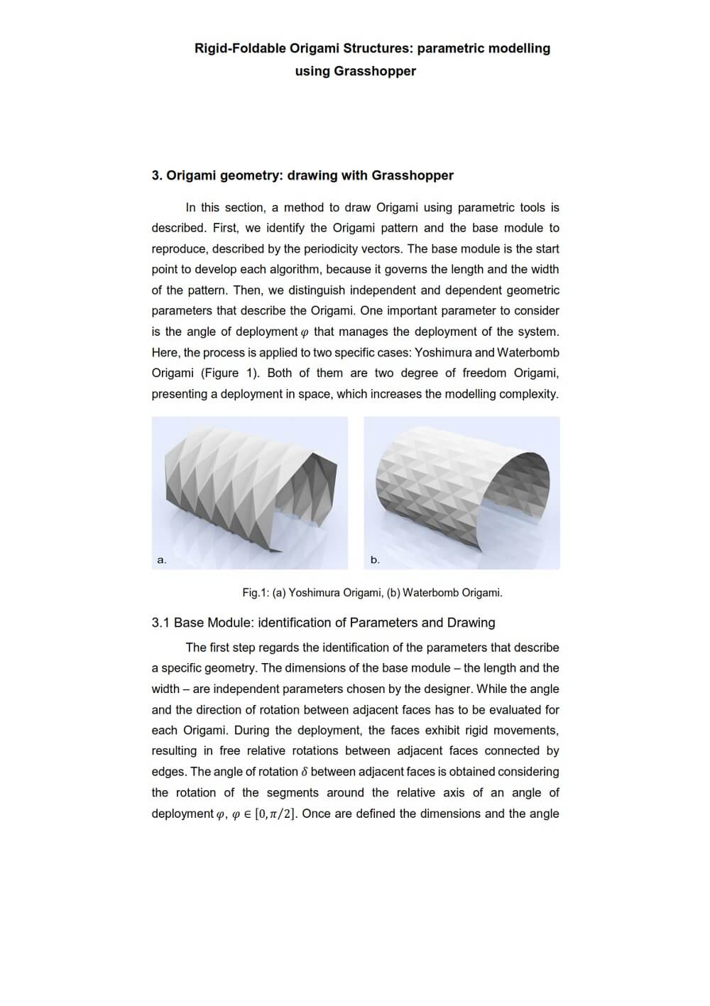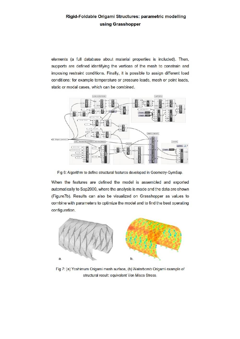 The parametric software Grasshopper has been applied to draw the geometry and to control the leading configuration parameters, while FEA software has been used to study the structural behaviour. To connect parametric and structural analysis software, GeometryGym (Grasshopper plug-in) has been investigated as particularly interesting to define the structural features. The purpose of this paper by Giulia Curletto is to provide a guideline to design Origami structures using parametric methodology and to describe drawing and structural analysis steps applied to two specific cases: Waterbomb and Yoshimura Origami.