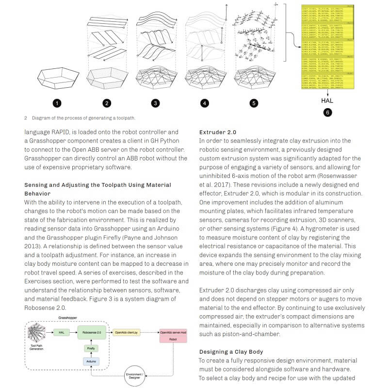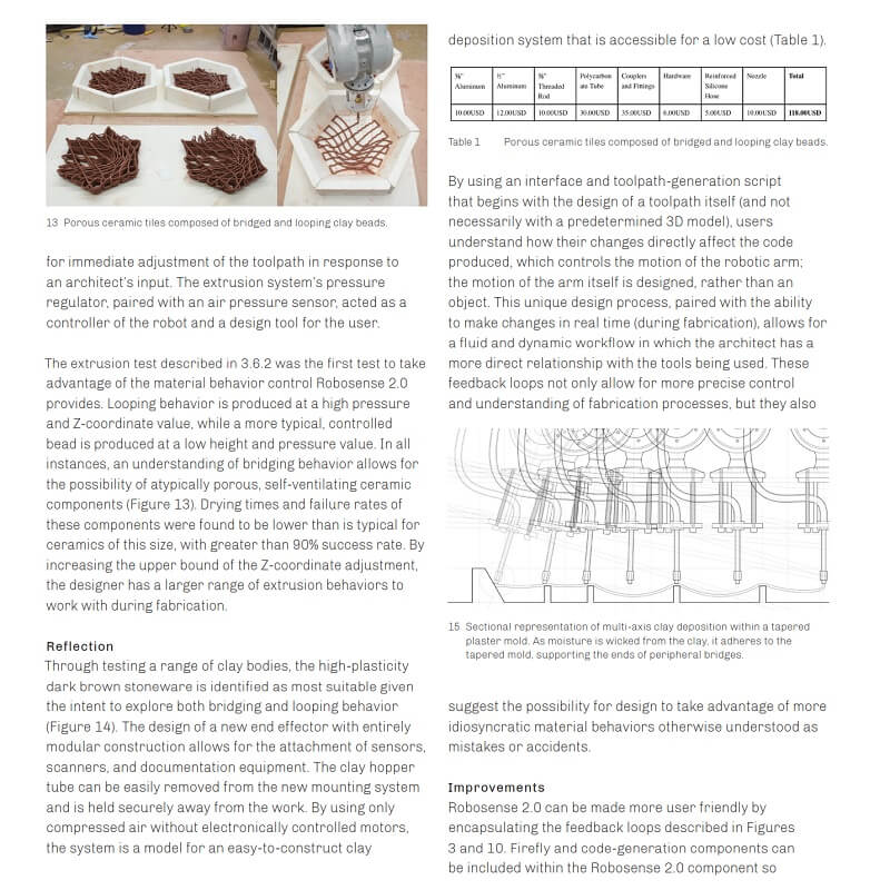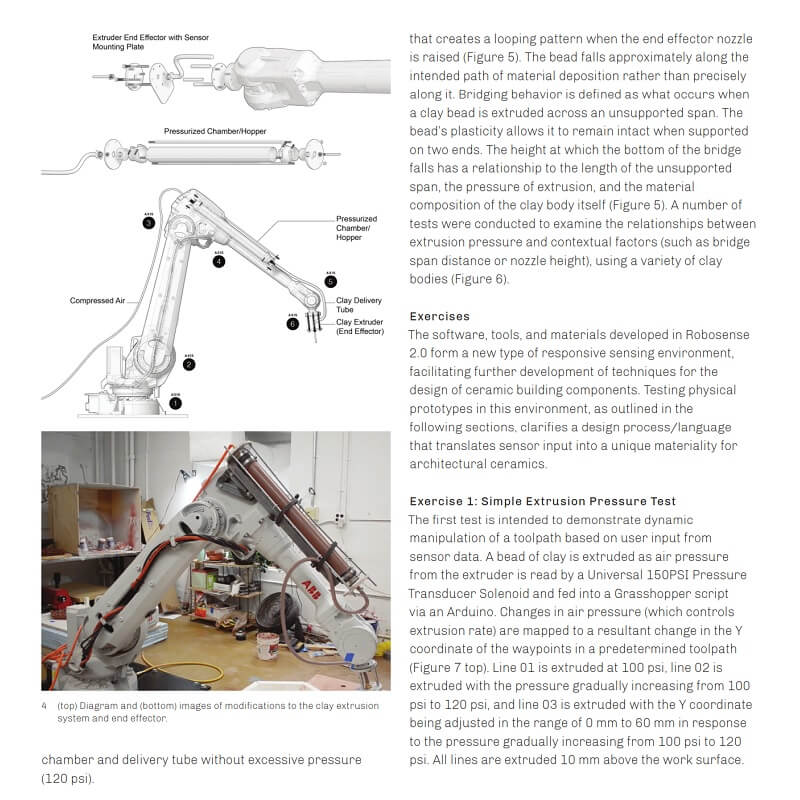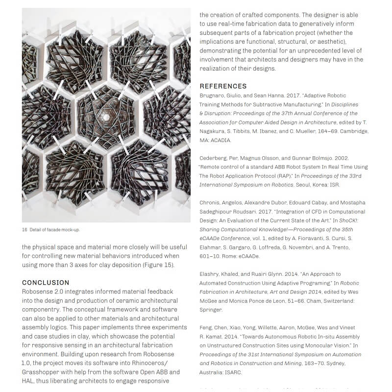 “Robosense 2.0: Robotic Sensing and Architectural Ceramic Fabrication” demonstrates a generative design process based on collaboration between designers, robotic tools, advanced software, and nuanced material behavior. The project employs fabrication tools that are typically used in highly precise and predetermined applications, but uniquely thematizes the unpredictable aspects of these processes as applied to architectural component design.