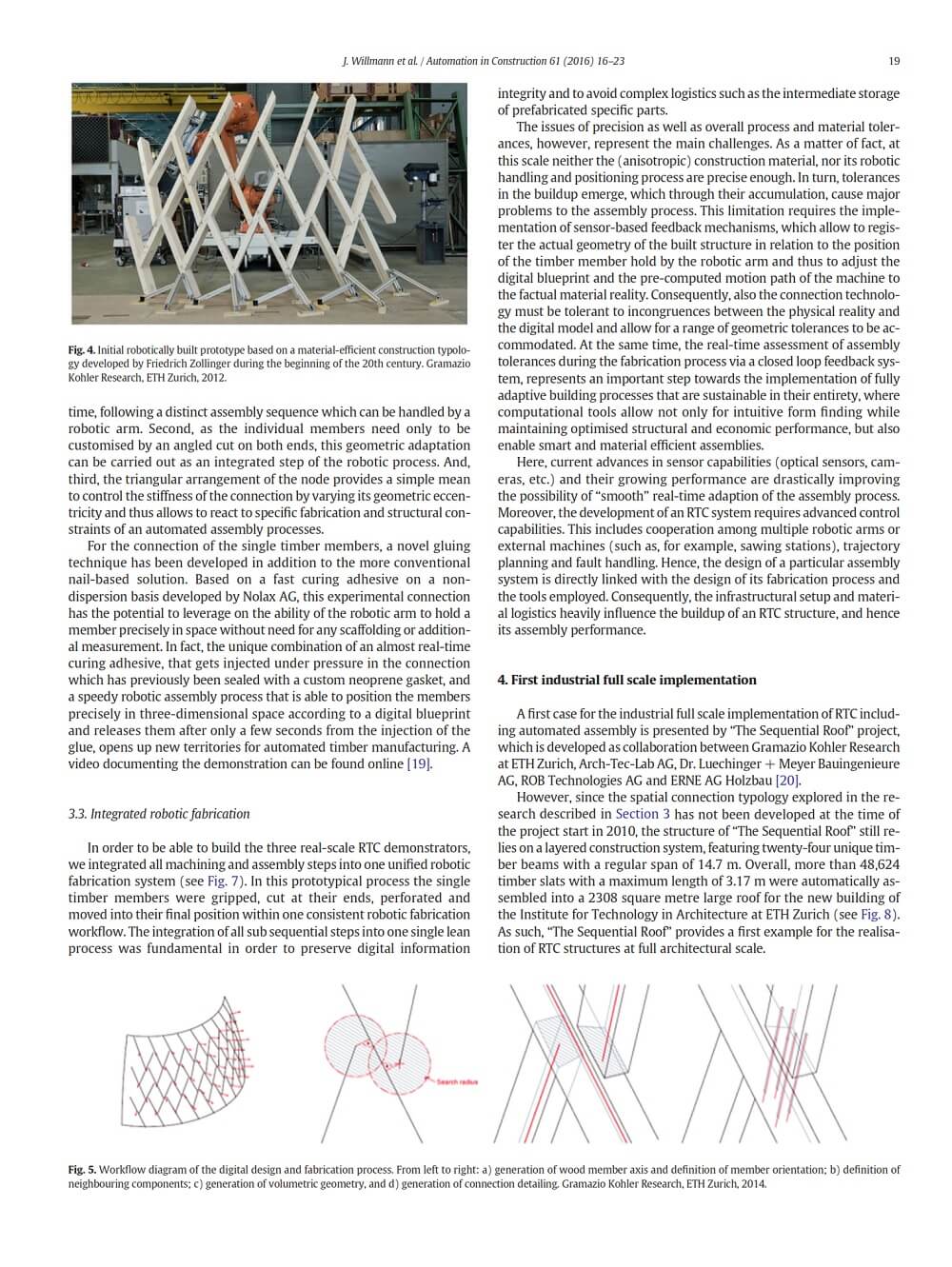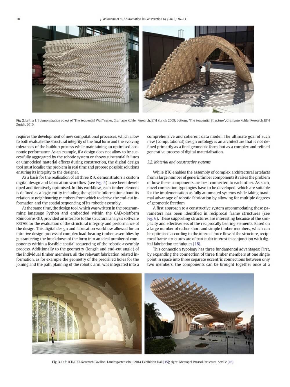 As such, RTC promotes unique advantages over conventional approaches to timber construction, such as, for example, CNC joinery and cutting: through the automated placement of material exactly where it is needed, RTC combines additive and largely waste-free construction with economic assembly procedures, it does not require additional external building reference, and it offers digital control across the entire building process, even when the design and assembly information are highly complex. This paper considers 1) re- search parameters for the individual components of RTC (such as computational design processes, construction methods and fabrication strategies), and 2) the architectural implications of integrating these components into a systemic, unifying process at the earliest stages of design. Overall, RTC leads to profound changes in the design, performance and expressive language of architecture and thus fosters the creation of architecture that profoundly reinvents its constructive repertoire.