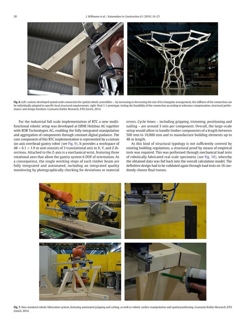 This paper by the group of Gramazio Kohler Research at ETH Zurich, presents a novel approach to non-standard timber assembly – Robotic Timber Construction (RTC) – where robotic fabrication is used to expand additive digital fabrication techniques towards industrial full scale dimensions. Featuring robotic systems that grasp, manipulate, and finally position building components according to a precise digital blueprint, RTC combines robotic assembly procedures and advanced digital design of non- standard timber structures. The resulting architectural morphologies allow for a convergence of aesthetic and functional concerns, enabling structural optimisation through the locally differentiated aggregation of material. This approach offers a new perspective on automated timber construction, where the focus is shifted from the processing of single parts towards the assembly of generic members in space.