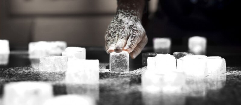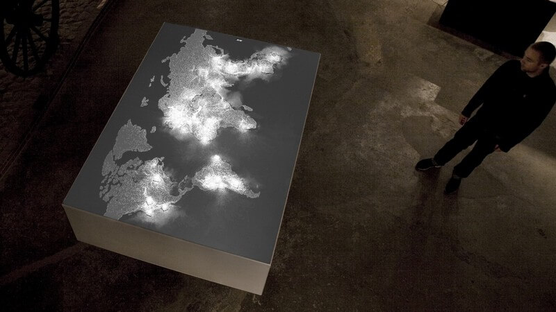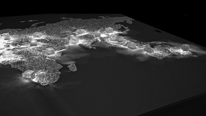 34 touch sensitive salt crystals spread over a world map highlighting the biggest salt mines. According to the amount of salt mined in these regions, millions of salt particles are emitted over the world map, slide down the mountain ridges, then diffuse and flow with the main sea currents.