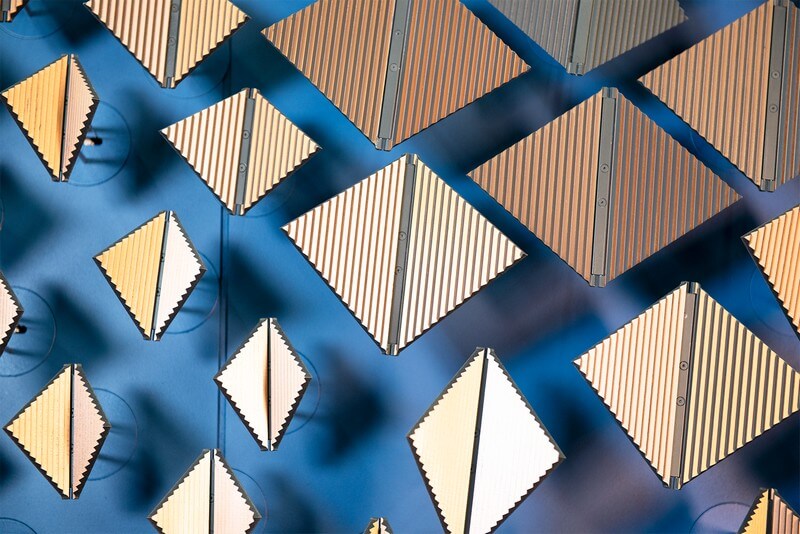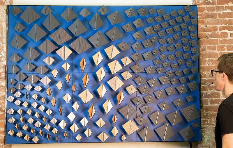 Seed and Signal was inspired by the study of fluttering butterflies and the beautiful patterns and colors they create. Designers found reference in the artworks of Danny Rosin, Tim Prentice, Ned Kahn, and Rob Ley. The color shift effect in this sculpture was created using custom lenticular surfaces, with one face painted glossy copper and the other painted gray. Behind each of the 200 pairs of wings, a motor drives an acme screw mechanism to animate the wings into position.