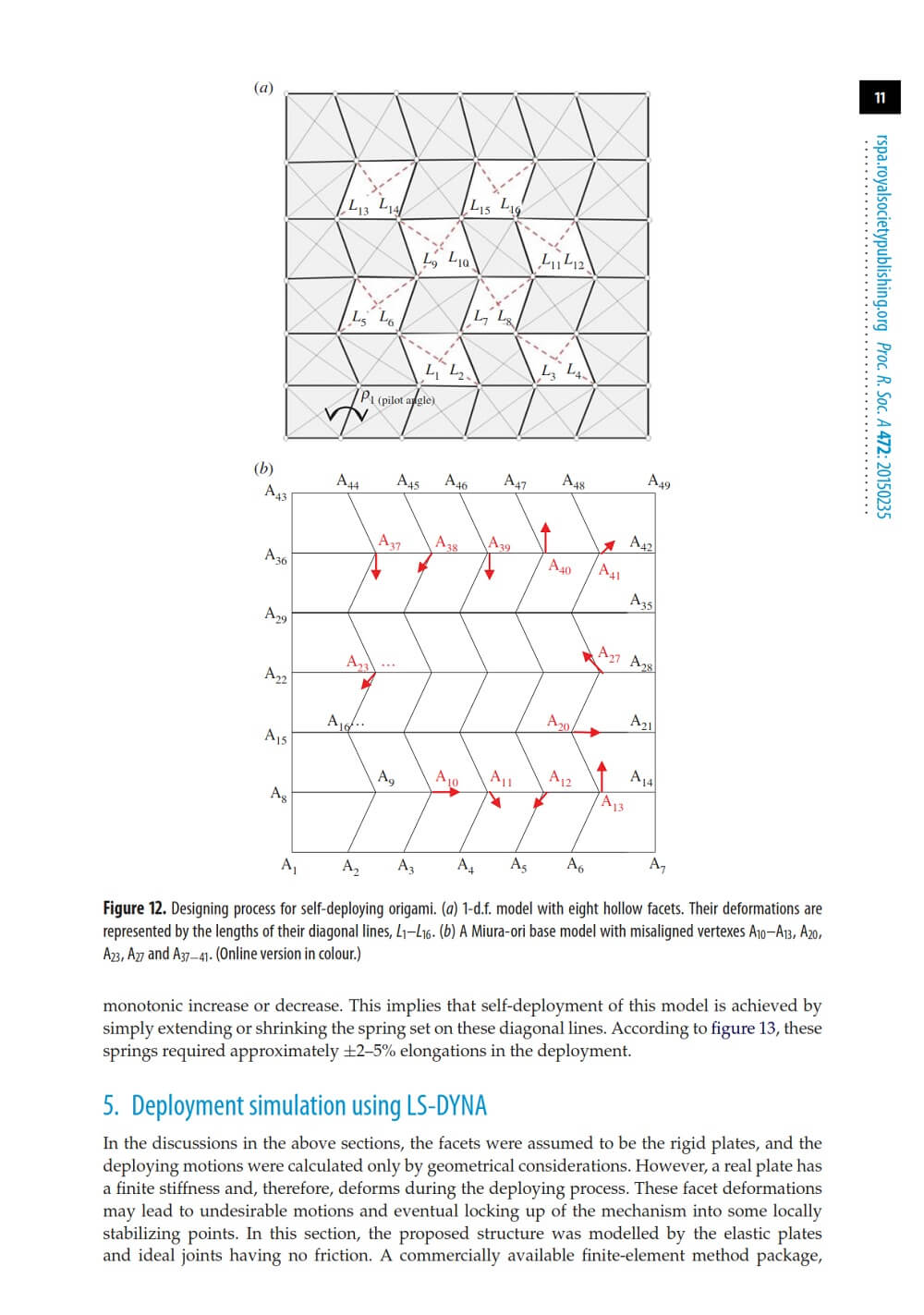 Usually, origami-based morphing structures are designed on the premise of ‘rigid folding’, i.e. the facets and fold lines of origami can be replaced with rigid panels and ideal hinges, respectively. From a structural mechanics viewpoint, some rigid-foldable origami models are overconstrained and have negative degrees of freedom (d.f.). In these cases, the singularity in crease patterns guarantees their rigid foldability. This study by Kazuya Saito, Akira Tsukahara and Yoji Okabe presents a new method for designing self-deploying origami using the geometrically misaligned creases. In this method, some facets are replaced by ‘holes’ such that the systems become a 1-d.f. mechanism.