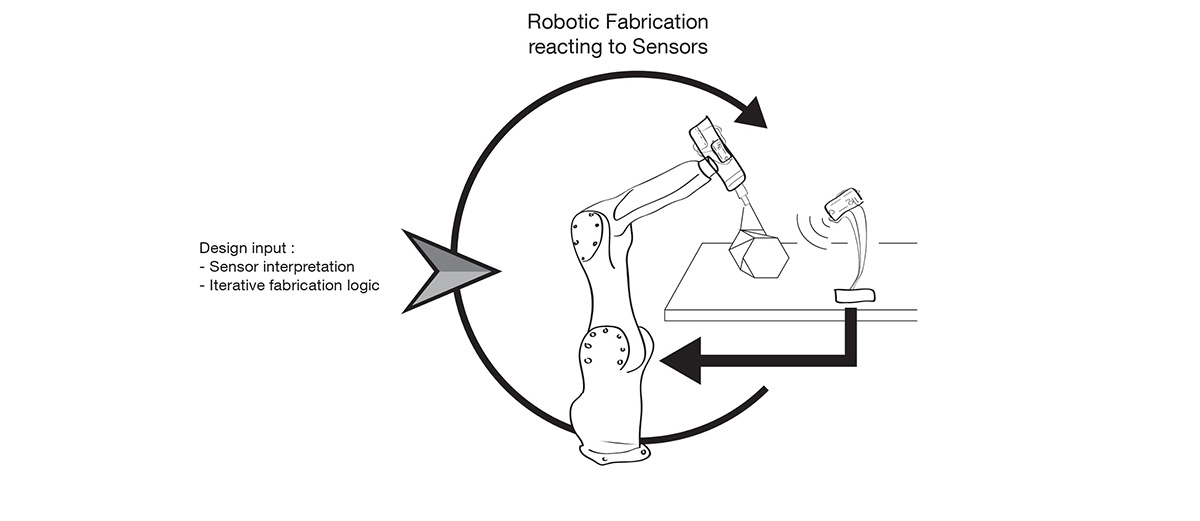 Robotic fabrication processes enable designers and architects to explore the boundaries between digital and material worlds. Beyond optimization criteria or parametric design, new design strategies such as generative design and collaborative design are enabling new ways of approaching material exploration through robotics.