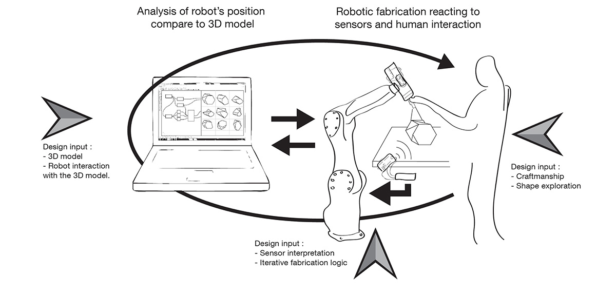The act of giving a machine freedom to assist the creative process leads to unexpected and useful information both from the machine and material perspective. By coupling Human-Machine Interface with robotic fabrication, sensor feedback and digital computation, new possibilities for creative collaboration are appearing. Collaboration between robots and human can enhance creativity and innovation by supporting designer and researcher while exploring complex material system.