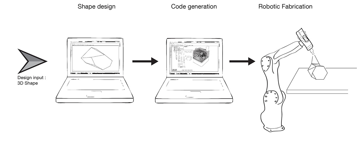 Robotic fabrication processes enable designers and architects to explore the boundaries between digital and material worlds. Beyond optimization criteria or parametric design, new design strategies such as generative design and collaborative design are enabling new ways of approaching material exploration through robotics.