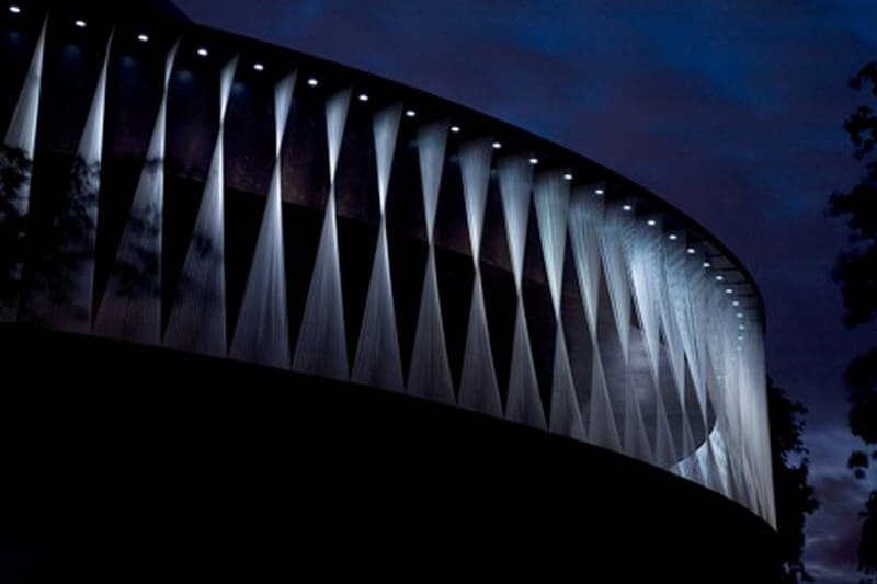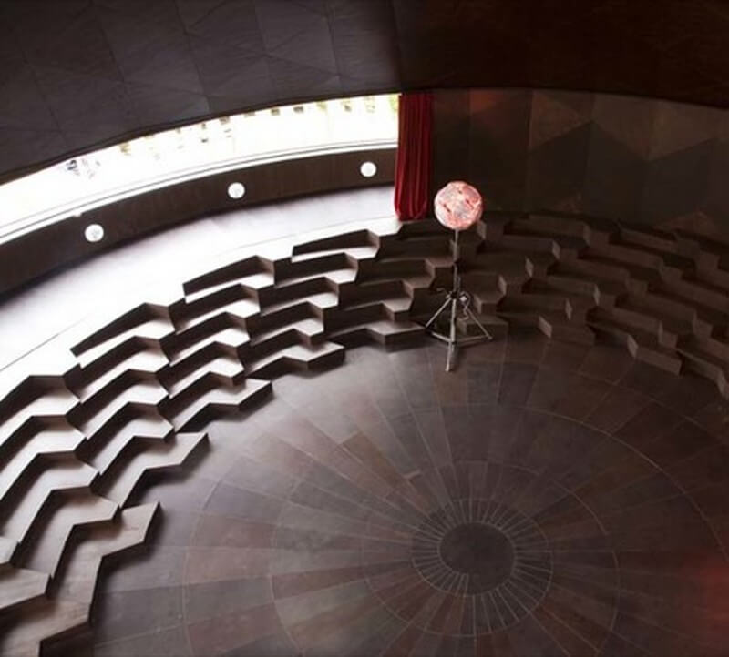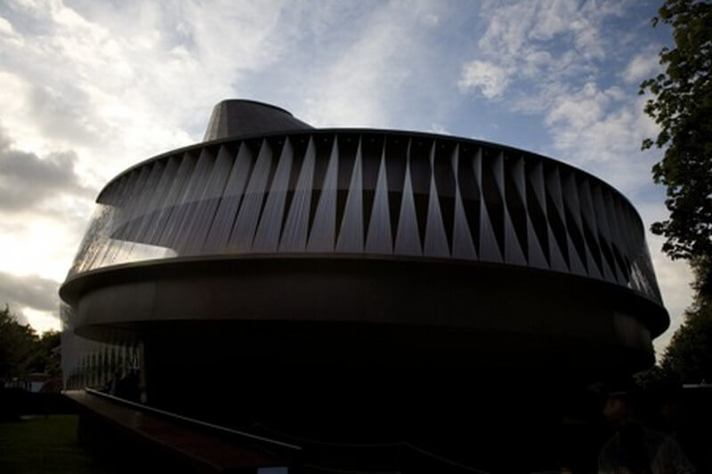 The Serpentine Pavilion 2007 is a spectacular and dynamic building. The timber-clad structure resembles a spinning top and brings a dramatic vertical dimension to the more usual single-level pavilion. A wide spiralling ramp makes two complete turns, ascending from the Gallery’s lawn to the seating area and continuing upwards, culminating at the highest point in a view across Kensington Gardens and down into the chamber below.