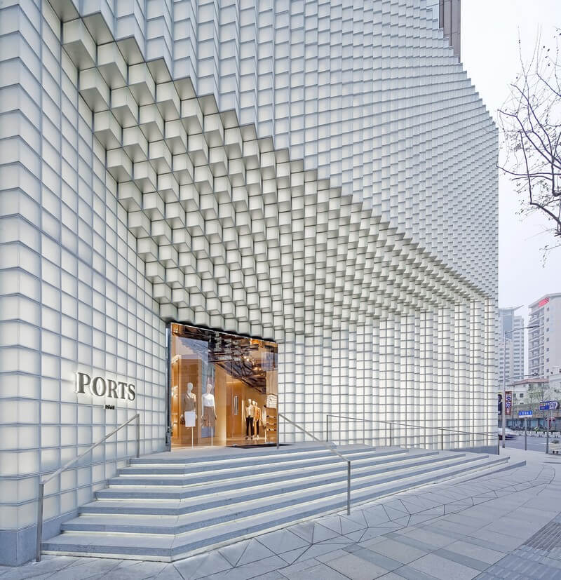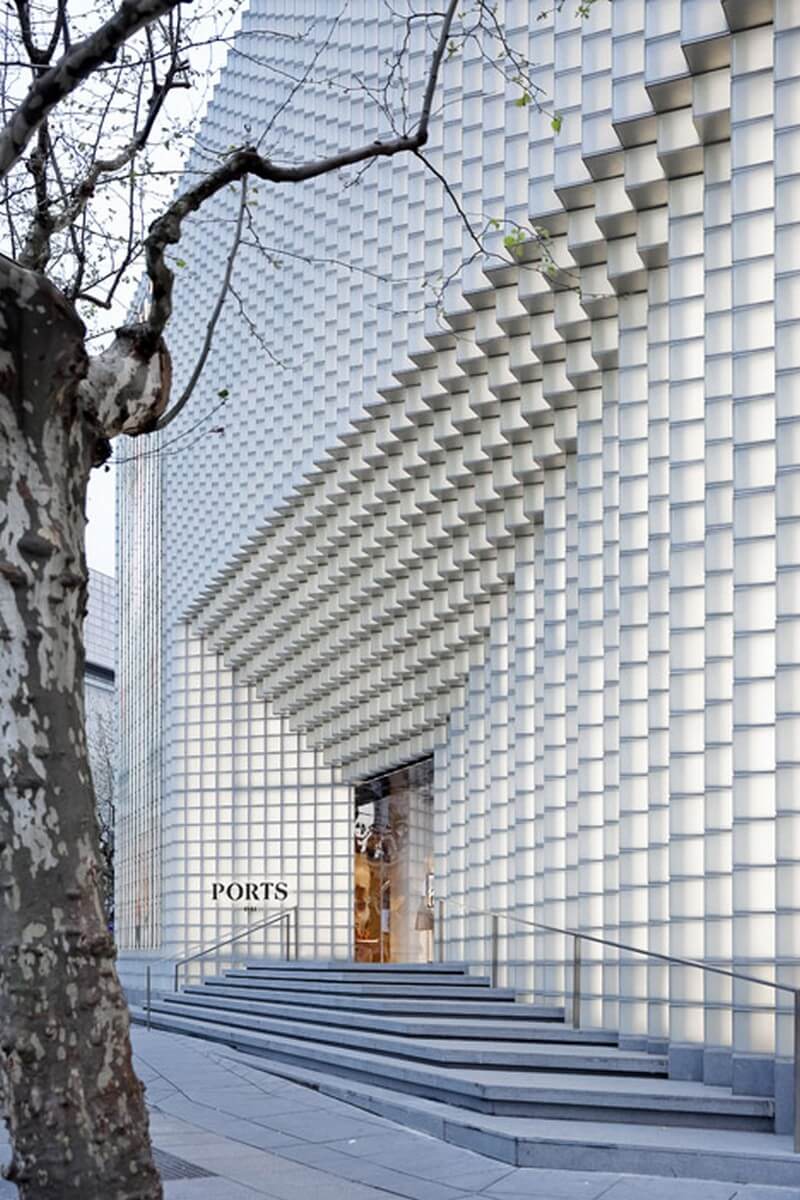 UUfie founders Eiri Ota and Irene Gardpoit Chan have been asked to update the facade of the Shanghai flagship retailer of vogue brand Ports 1961, which sits at the busy intersection of Changde Street and Nanjing West Street in the city’s business district. Glass blocks are organized in a meticulous gridded pattern across the walls of the constructing.