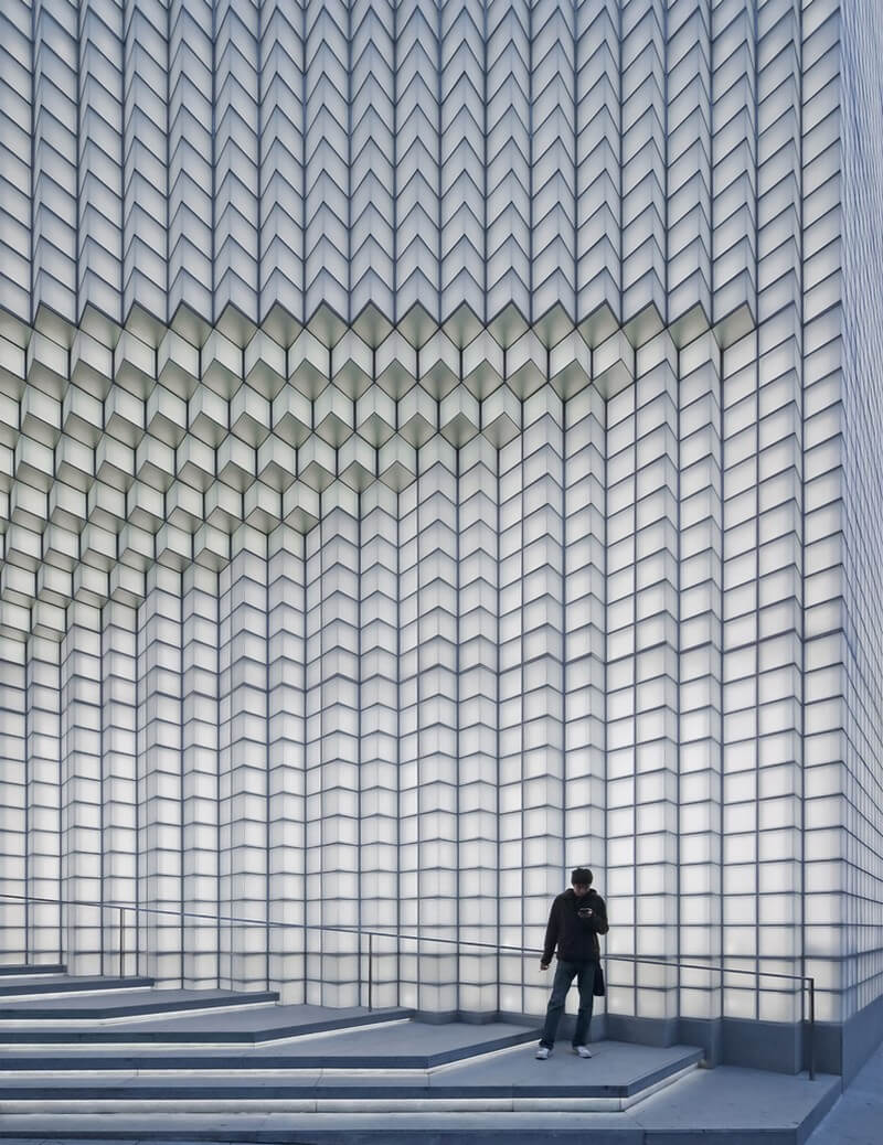 The translucent glass provides the developing a subdued grey colouring throughout the day but at night LEDs set in joins between the blocks illuminate the facade like a display.