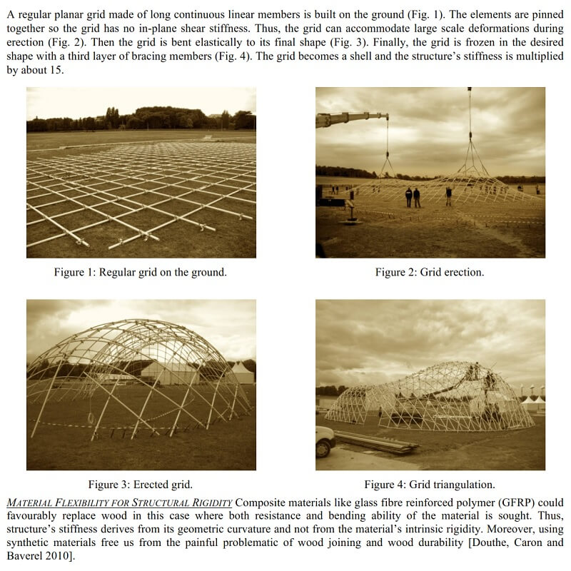This paper by Lionel Du Peloux, Olivier Baverel, Jean-François Caron and Frédéric Tayeb introduces and explains the design process of a gridshell in composite materials built in Paris in 2011 for the festival Soliday. A brief introduction presents the structural concept and the erection methodology employed.