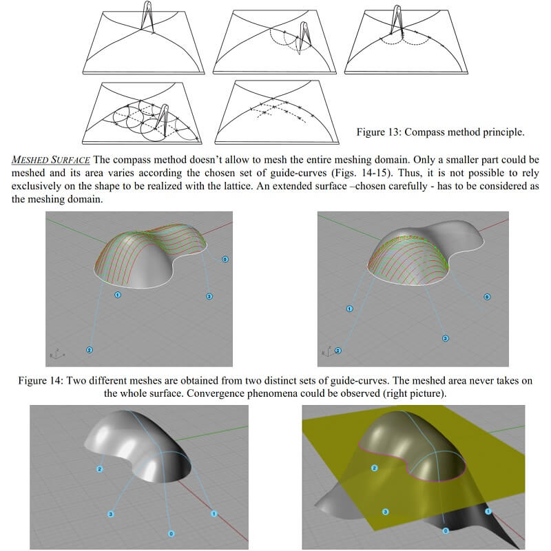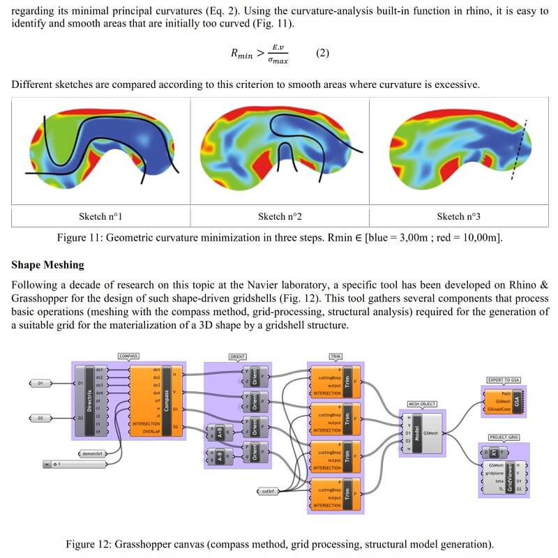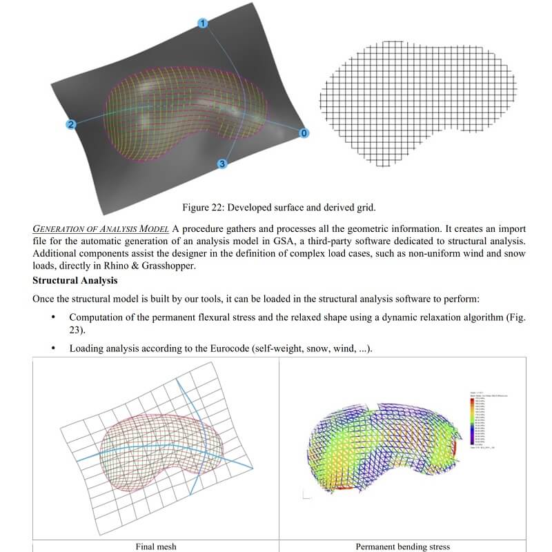 This tool allows designers to look for optimal mesh orientations regarding the elements curvature Finally, a full structural analysis is performed to find the relaxed shape of the grid and check its stability, strength and stiffness under loads. The authors conclude on the overall relevance of such structures.