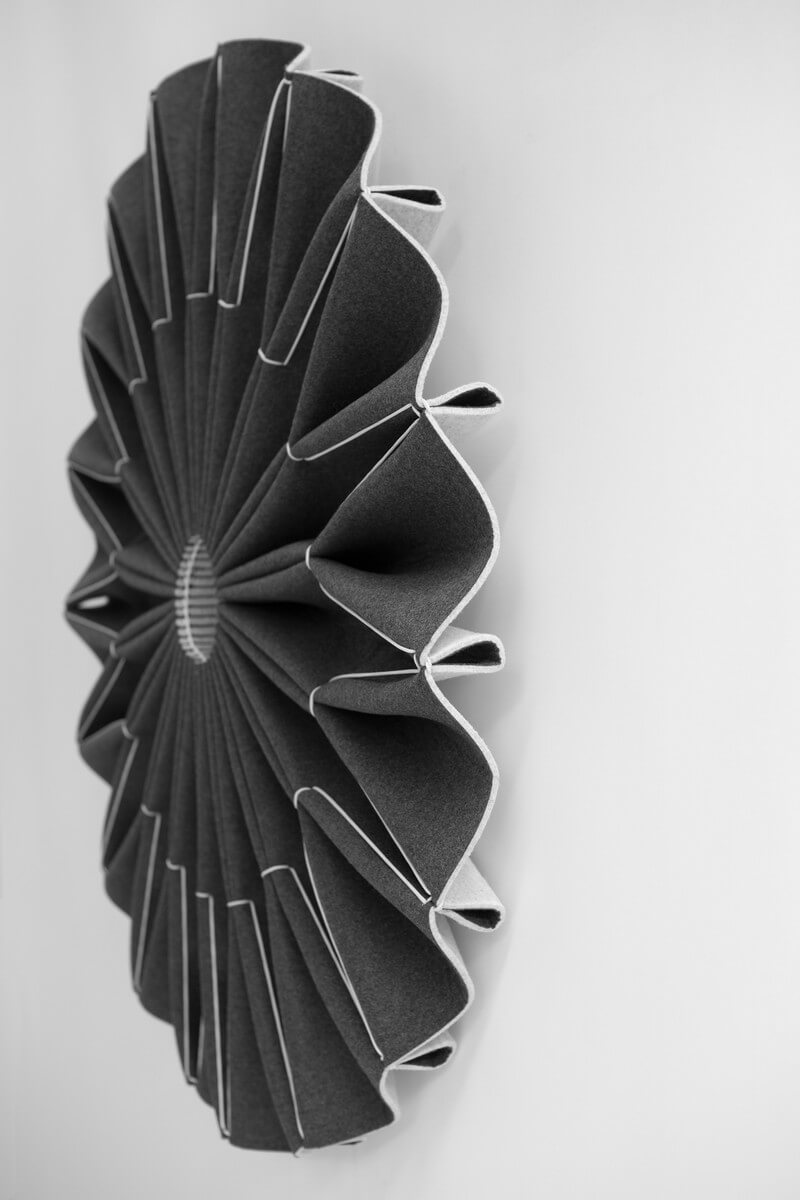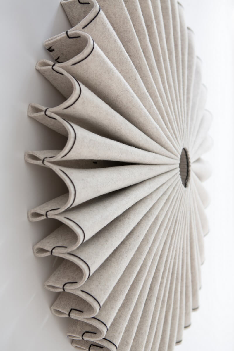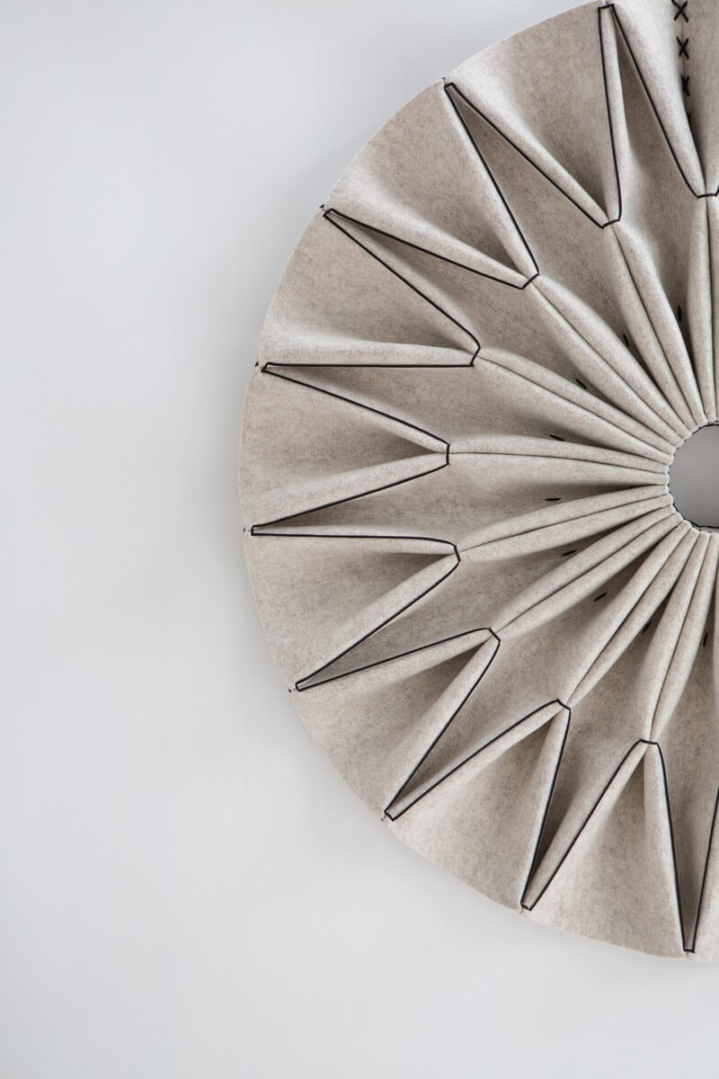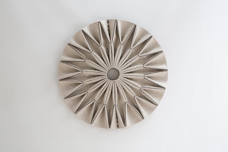 The team looked at ancient smocking and pleating techniques used in fashion design to arrive at the circular felt pendants. Each one is made up of folded felt that’s sewn to create tension and flexibility. With the numerous folds, the surface area increases to accomplish its goal of reducing sound.