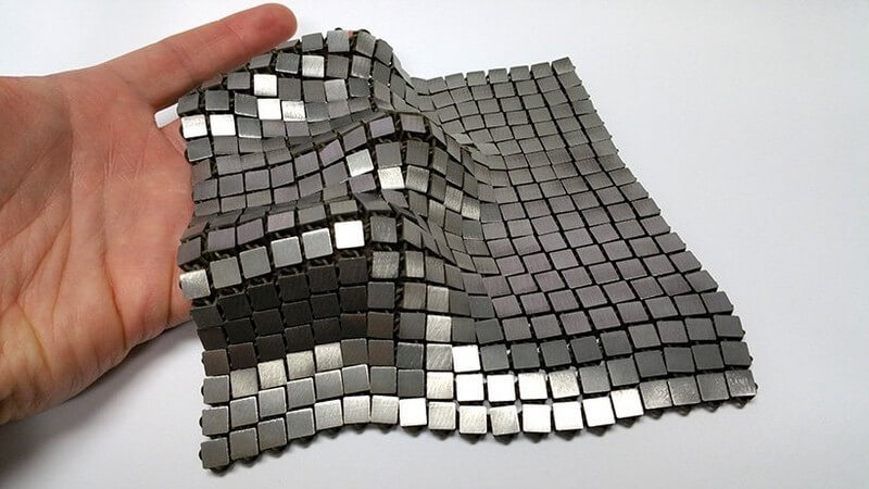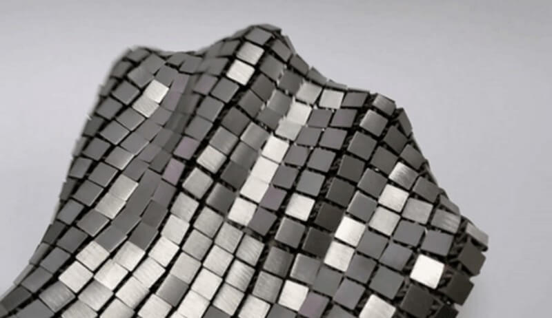 The material is being developed by NASA’s jet propulsion laboratory, with the project led by raul polit casillas. the woven metal materials are made up of tiny silver squares strong together, yet manufactored all in one piece using 3-D printing technologies. so where does the fourth dimension come from? ‘we call it 4D printing because we can print both the geometry and the function of these materials,’ explains polit casillas. ‘if 20th century manufacturing was driven by mass production, then this is the mass production of functions.’ so, the chosen functionalities of NASA’s material are reflectivity, passive heat management, foldability, and tensile strength. whilst one side of the fabric reflects light, the other absorbs it, acting as a means of thermal control.