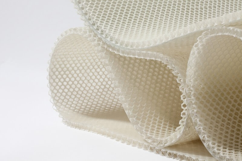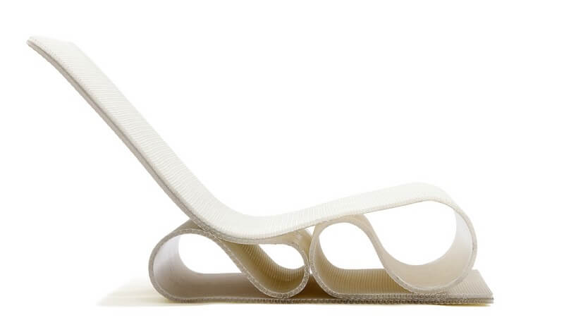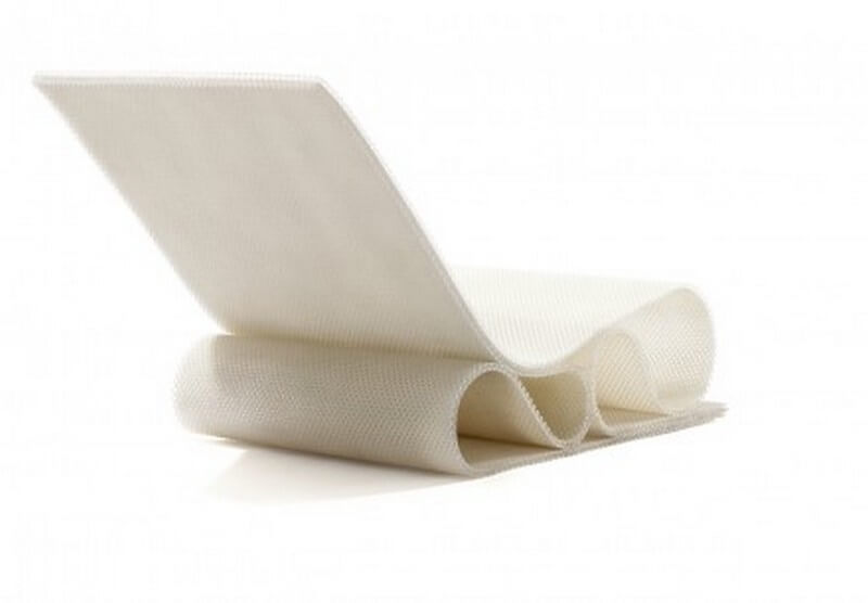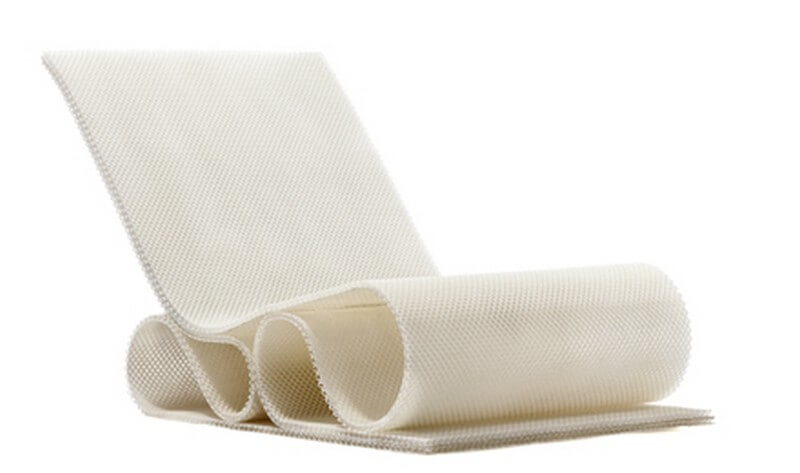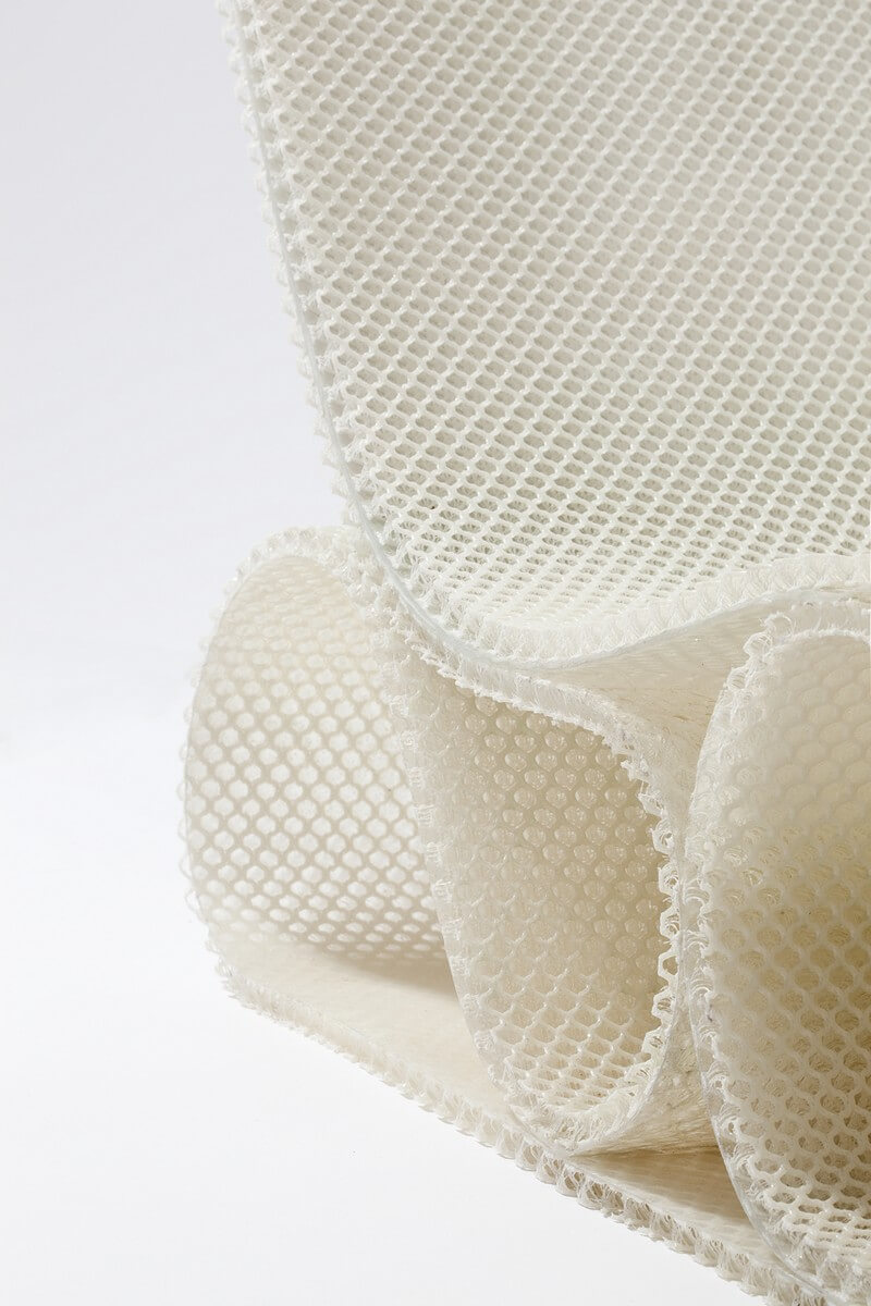 A soft and open mesh fabric turns into a spacious chair by a synthesis of constructive folding and hardening. Inspired by the carpet production process, Studio Samira Boon designed the chair based on the same principles: two pieces of fabric are partly interwoven and partly separated.
