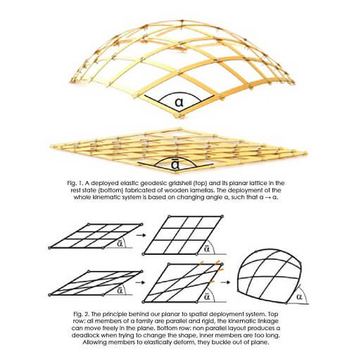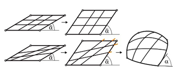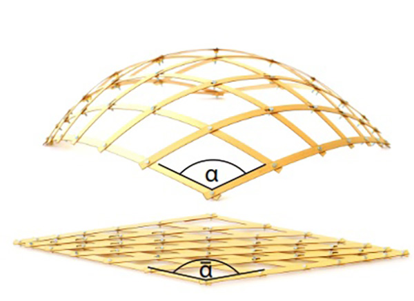 By adjusting only one degree of freedom, for example the angle α → α at one corner, the planar kinematic configuration elastically bends continuously into a spatial gridshell which approximates the desired surface. The deployment process is governed by the rules of physics, seeing the lamellas as thin elastic minimal energy beams, allowed to bend as well as to rotate and slide at their intersections.