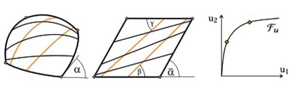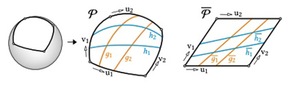 Our goal is to find a suitable planar setup of the lamellas that can be deformed into a spatial grid, fitting the target surface as closely as possible. To achieve this goal, we propose a solution based on networks of geodesic curves on the target surface.