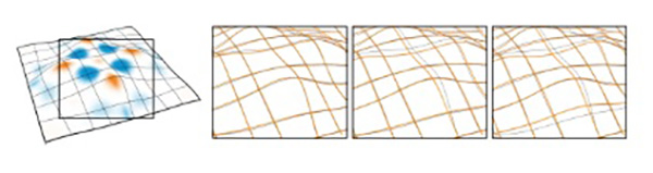 Fig. 13. Computed and simulated results without make, renderings of the simulation and the planar grid. The orange lines follow our simulation with notches. The dark lines follow the shortest geodesics on P.