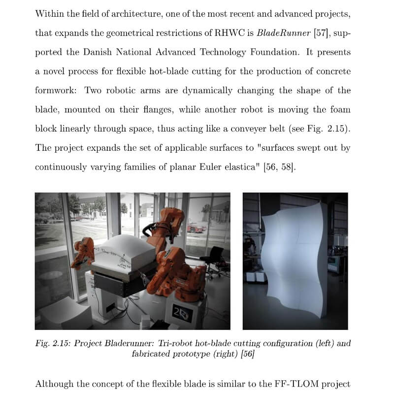 This thesis by Romana Rust, develops around a multi-robotic hot-wire cutting technique, that allows to significantly expand the set of possible hot-wire cutting geometries. In contrast to standard computer-controlled hot-wire cutting processes, in which the cutting medium remains straight, this technique modulates the curvature of the hot-wire, which adopts itself against the resistance of the processed material.