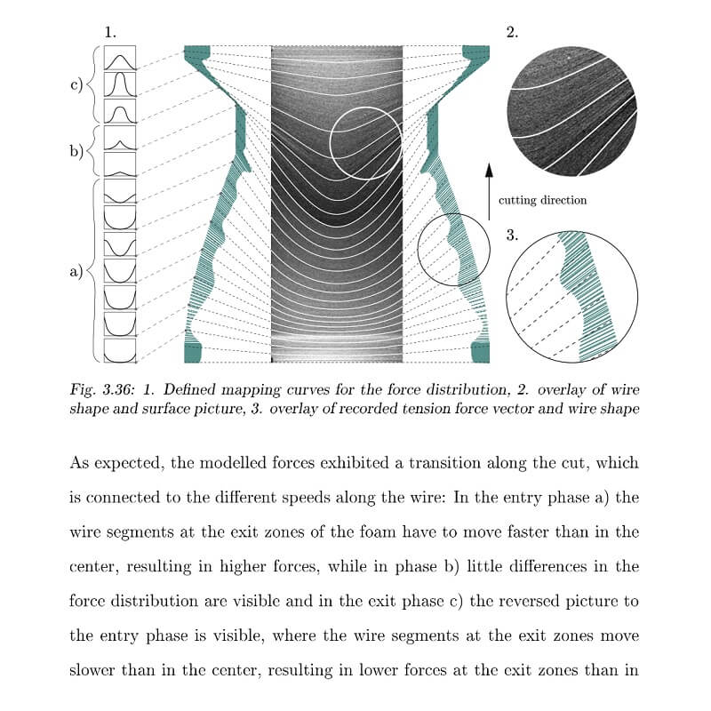 The aim of this thesis is to develop methods and techniques that allow to control this cutting technique and to foresee its outcome. Knowledge is acquired directly from the physical form-finding process and implemented in a respective digital model. The thesis investigates material- and fabrication process-related constraints, correlations between operating physical factors, such as heat input, cutting speeds, resulting cutting forces and wire shape.