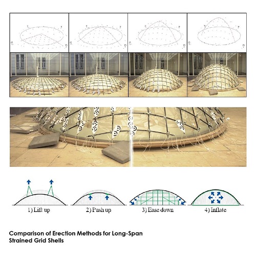 There are three tried and tested ways to erect a strained grid shell: ‘lift up’, ‘push up’ & ‘ease down’. The practicality of each method and the effect on structural behaviour varies.