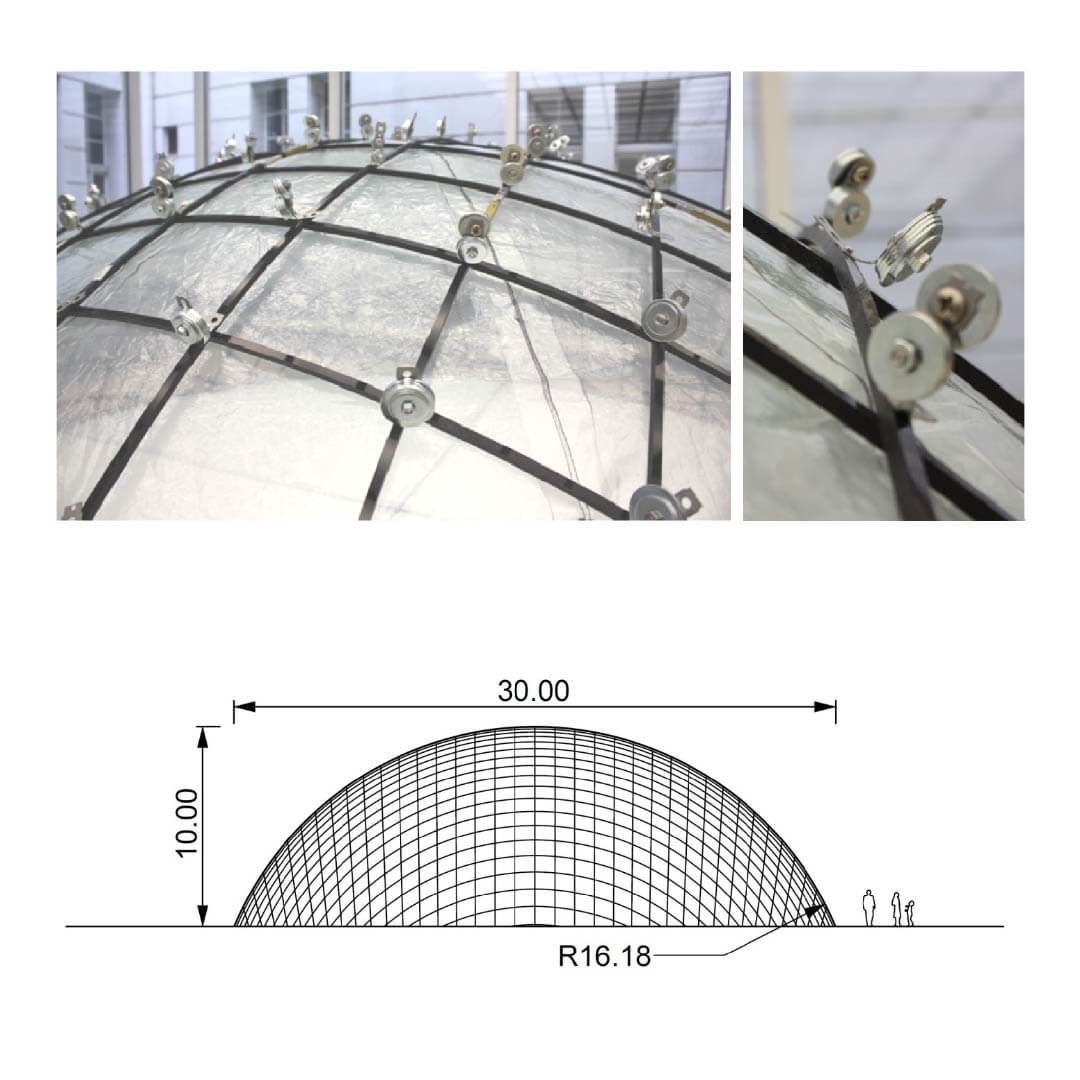These investigations were carried out on a case study of a dome with a 30m span, 10m pitch and constant double curvature.