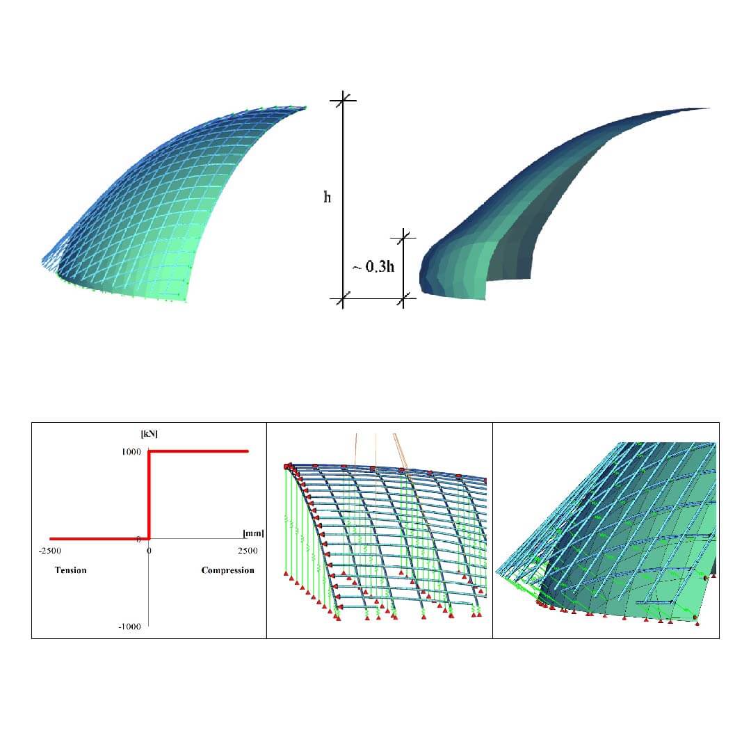 A detailed description is provided of the developed simulation approach, which makes particular use of contact springs for a structural system subject to large deformations, in the SOFiSTiK FE software environment.