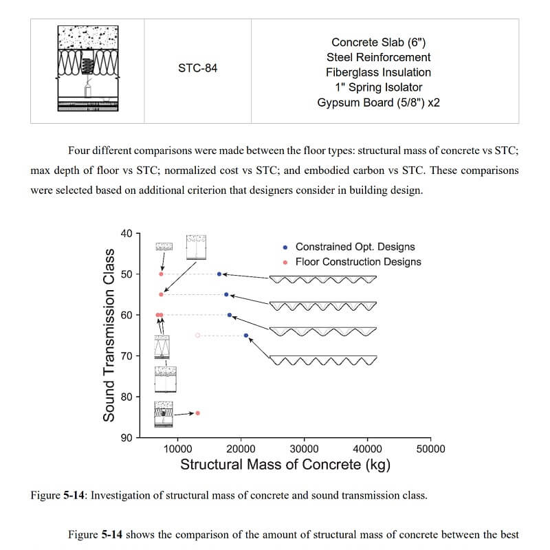 The acoustic characteristic of transmission loss, which describes the amount of sound transmitted through a structure, is a concern while shaping concrete slabs, as geometry-based structural optimization may create an unsatisfactory acoustic environment between building floors. The acoustic metric, sound transmission class (STC), is used to provide a single number quantity to represent the transmission loss values in one-third octave bands.