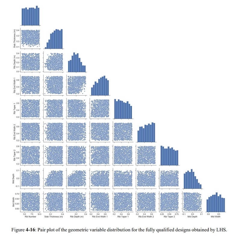 The structural model and acoustic model identify slab designs that meet all the structural and acoustic checks. Following initial design space exploration, multi-objective optimization (MOO) was used to improve upon the resolution of obtaining the best shaped slabs in the design space while confirming the general structural-acoustic trends from LHS.