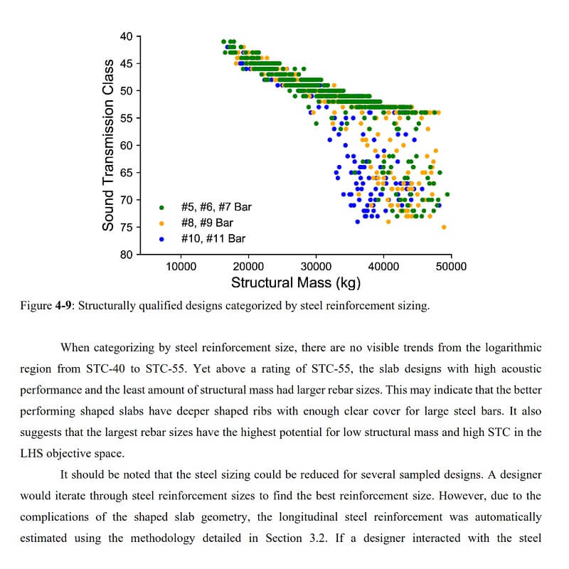 The design space was sampled using Latin Hypercube Sampling (LHS) to determine broad relationships between structural mass and STC. Structural mass is the objective that relates to embodied carbon; as structural mass decreases, the amount of embodied carbon the slab has decreases. STC is a standard metric that quantifies acoustic performance of speech and noise transmission through a structure.