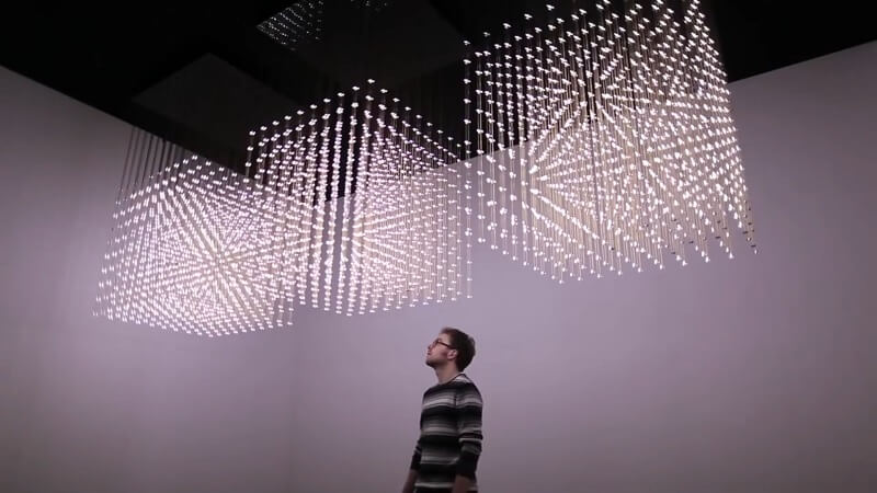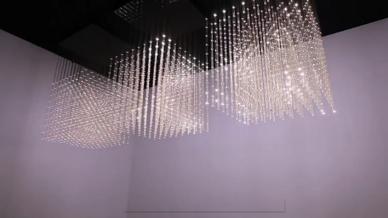 The ‘Swarm Light’ by rAndom International is an experimental light installation with a real ‚collective consciousness’ that subtly reacts to the viewer’s audible presence. The installation is a contemporary example of how the arbitrary boundaries of fine and decorative art, design and utility are no longer of immediate aesthetic relevance. An apparently inanimate object, ‘Swarm’ unites crucial aspects of rAndom international’s continued experimentation with light, behavioural responses and interactive spatial environments.