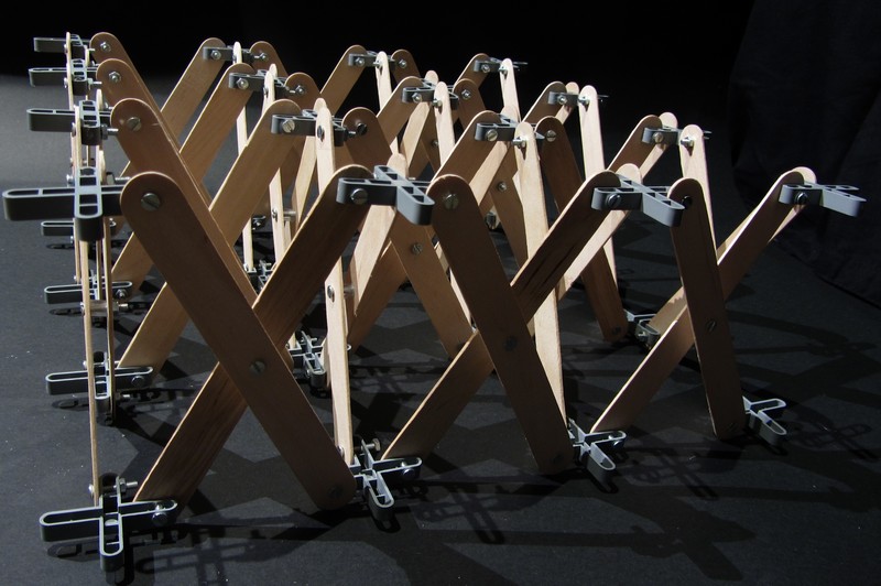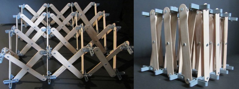 The grouping of scissors makes a different kind of geometry, which depend of the location of the central joint of the scissors. The development of physical prototypes allows to understand the geometry and the movement of scissors structures.. The model is made by grouping of symmetrical straight scissors with central joint. When the model is opened, it creates a flat surface, it does a lineal deployment in two directions.
