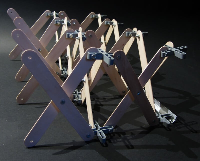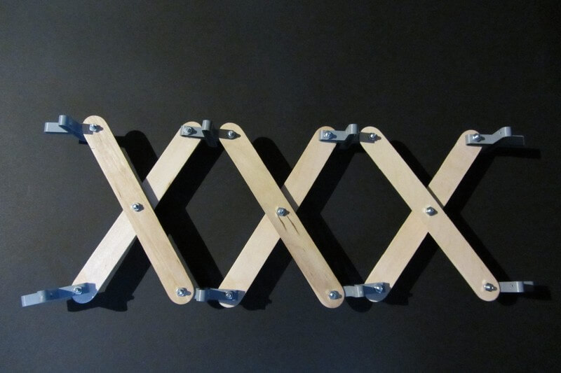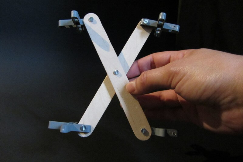 The making process of the model is very simple, the materials are easy to find and affordable. The scissors in this case are made by linear elements of wood (popsicle sticks) of 15 cm of length and 1.8 cm of width. The axes of the joints of the scissors are made by screws and nuts. The joints between scissors are made using joints spacer for tiles of 7 mm of thickness.
