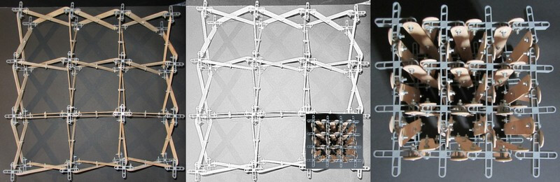 The central topic of this work by SMiA Research Group is the explanation of the making process of a scale model, which makes a spatial grouping of symmetrical straight scissors. In order to understand this kind of structure, first it is necessary to identify their components. A scissors is the joint of two straight bars, and the grouping is the joint of several scissors in two directions.
