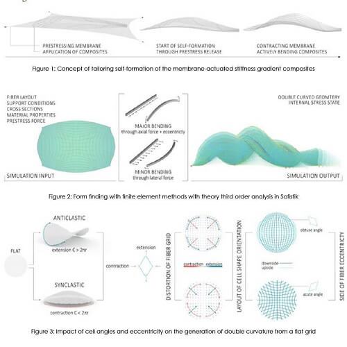 Through the prestress release the contracting membrane actuates active bending of the composite elements, thus the system self-forms into an anticipated double curved geometry. Its geometric outcome is tailored by the stiffness gradient of the composites. The material system is introduced by the authors with the term membrane-actuated stiffness gradient composites (MASGC).